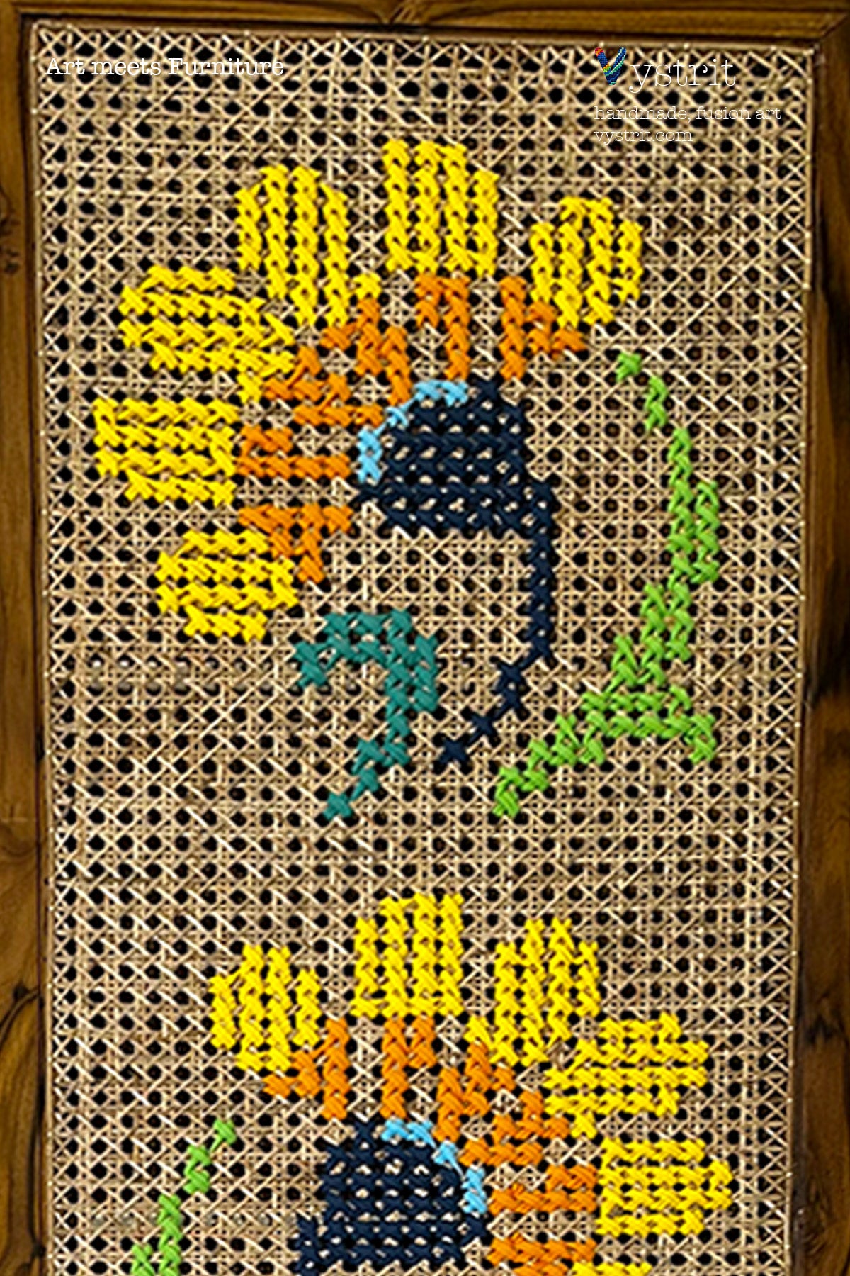 - Art: mixed textile art hand stitched on cane webbing