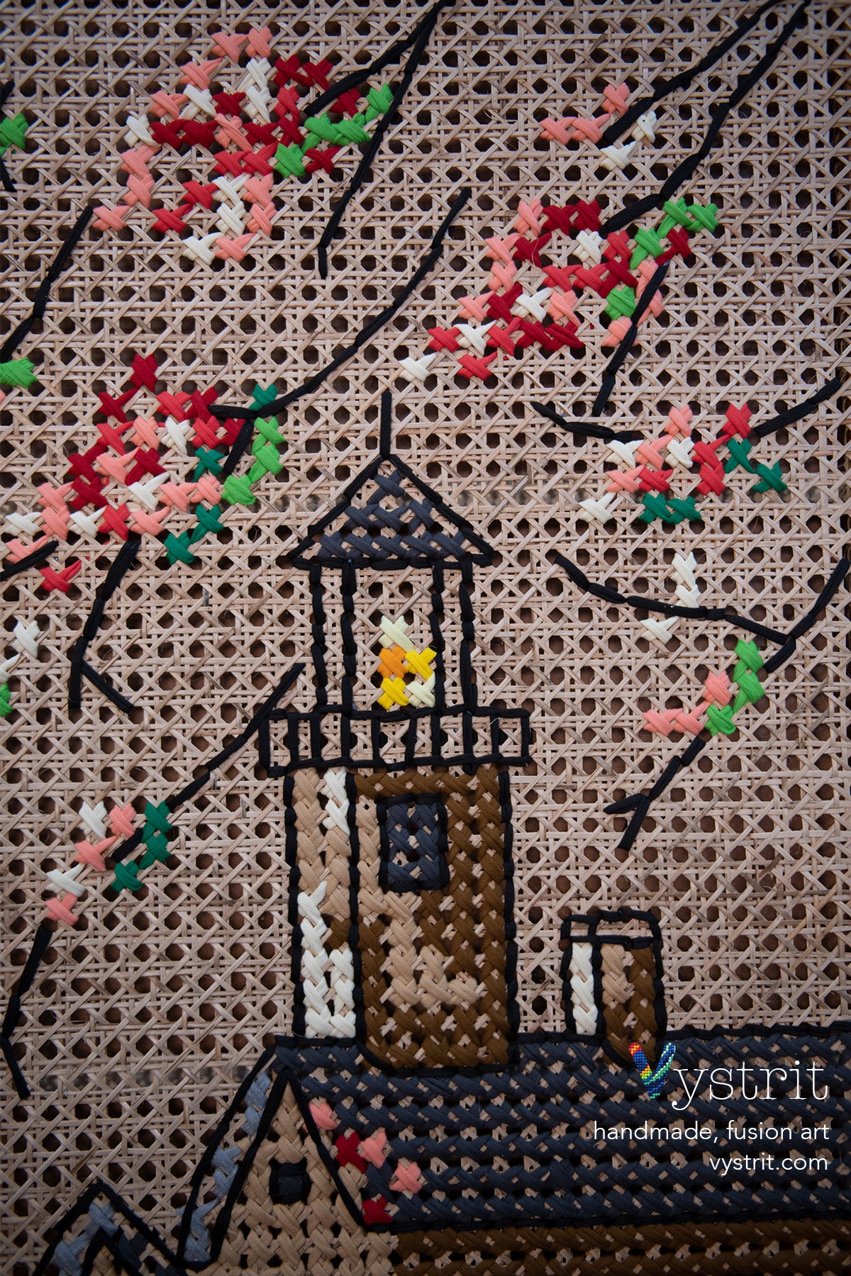 Finer details: You will notice a crumbling roof of the house - looking crooked on the left side. The paint is peeling off from the lighthouse and the hut-house. On the left you see a calm sea with a water vessel navigating confidently.