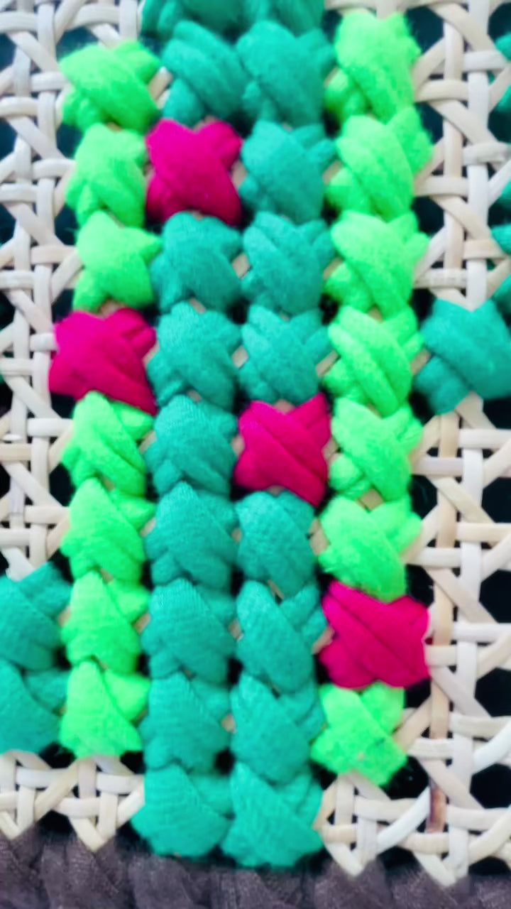 - Material: Handmade Teak wood frame, natural star pattern rattan mesh (cane webbing), textile/ threads