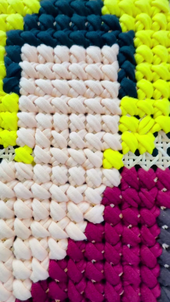 - Material: Handmade Teak wood frame, natural star pattern rattan mesh (cane webbing), textile/ threads