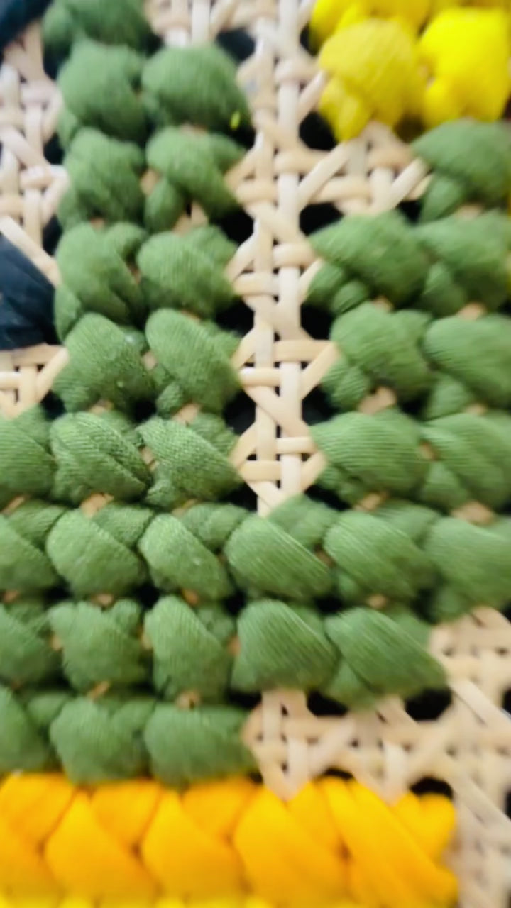 Material: Handmade Teak wood frame, natural star pattern rattan mesh (cane webbing), textile/threads
