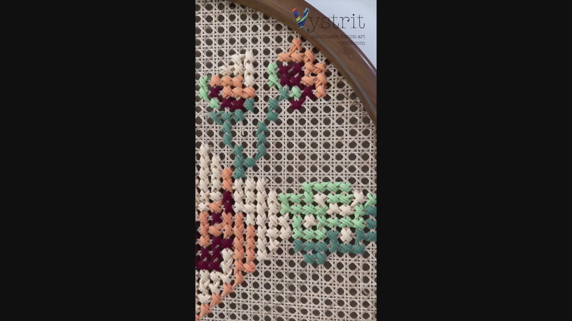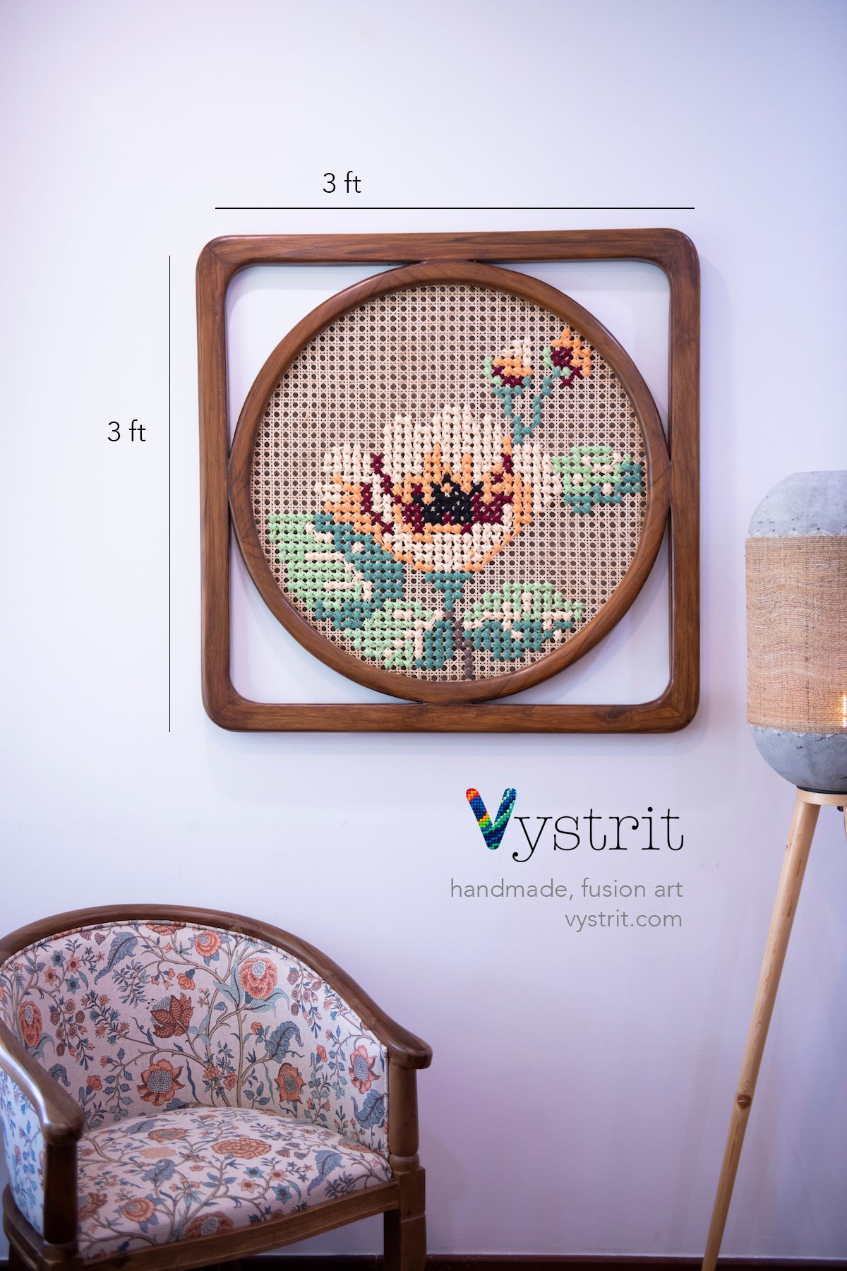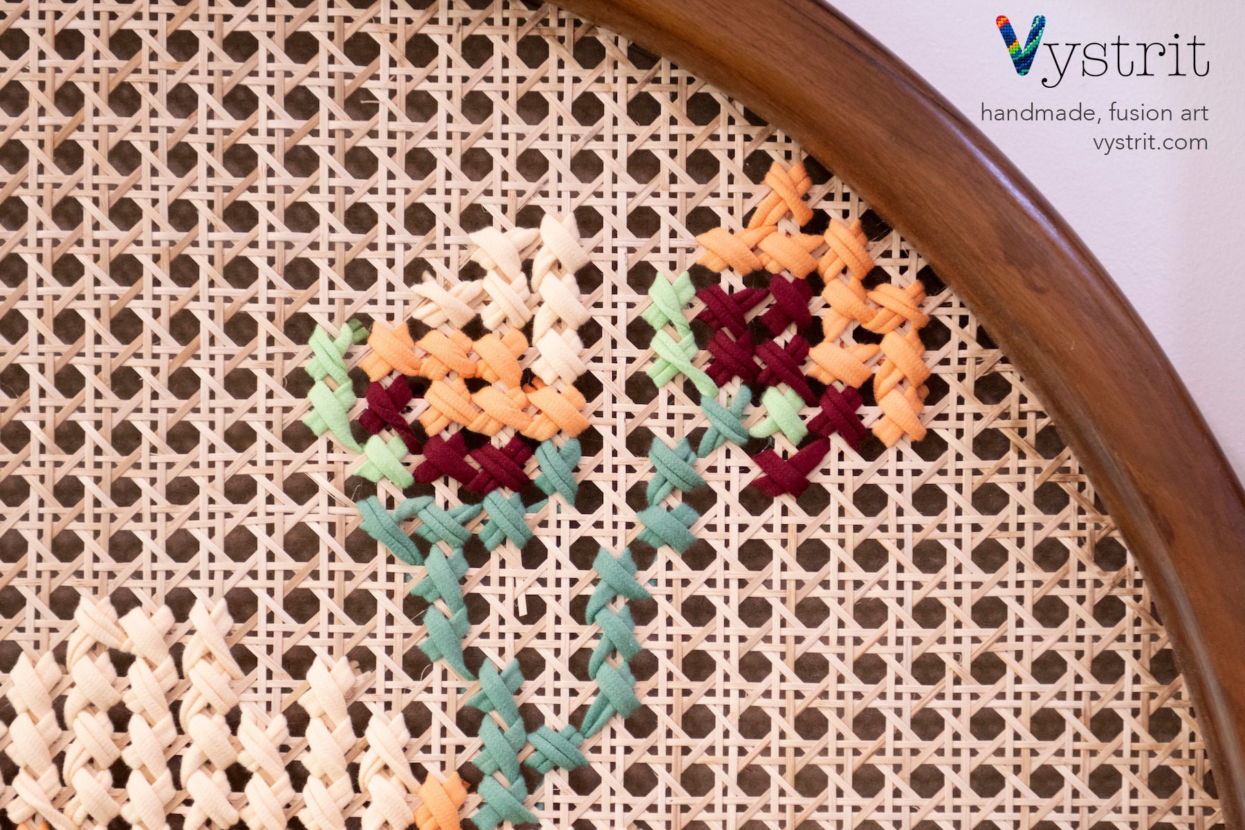 - Material: Handmade Teak wood frame, natural star pattern rattan mesh (cane webbing), textile/ threads