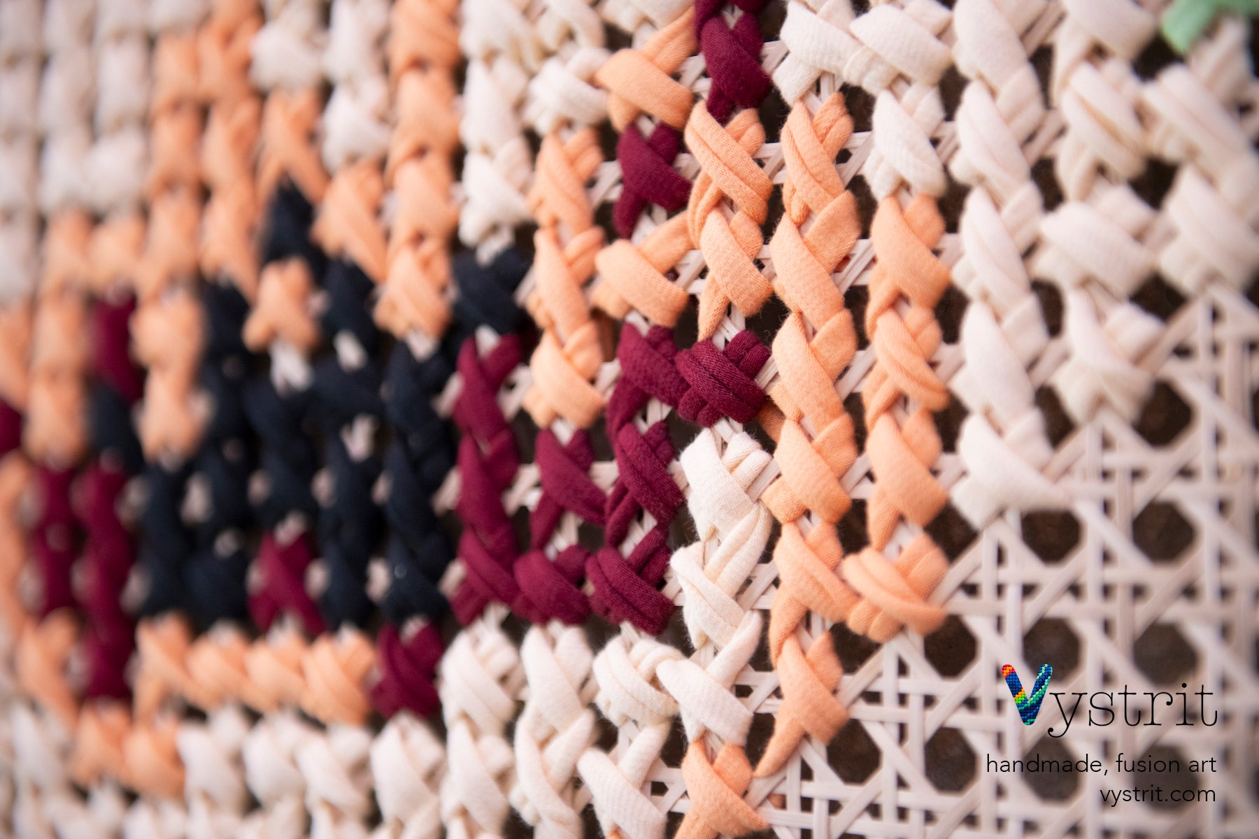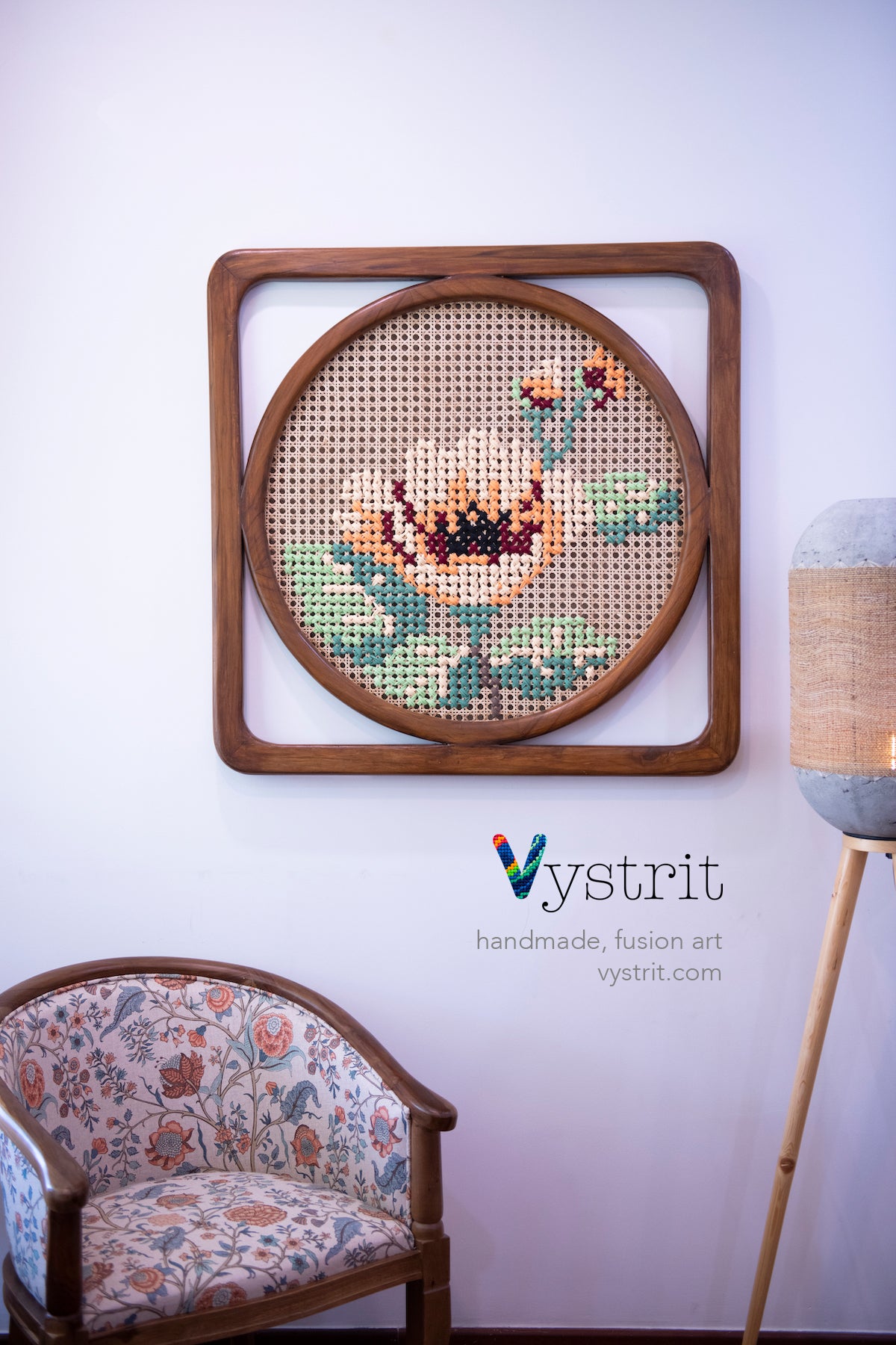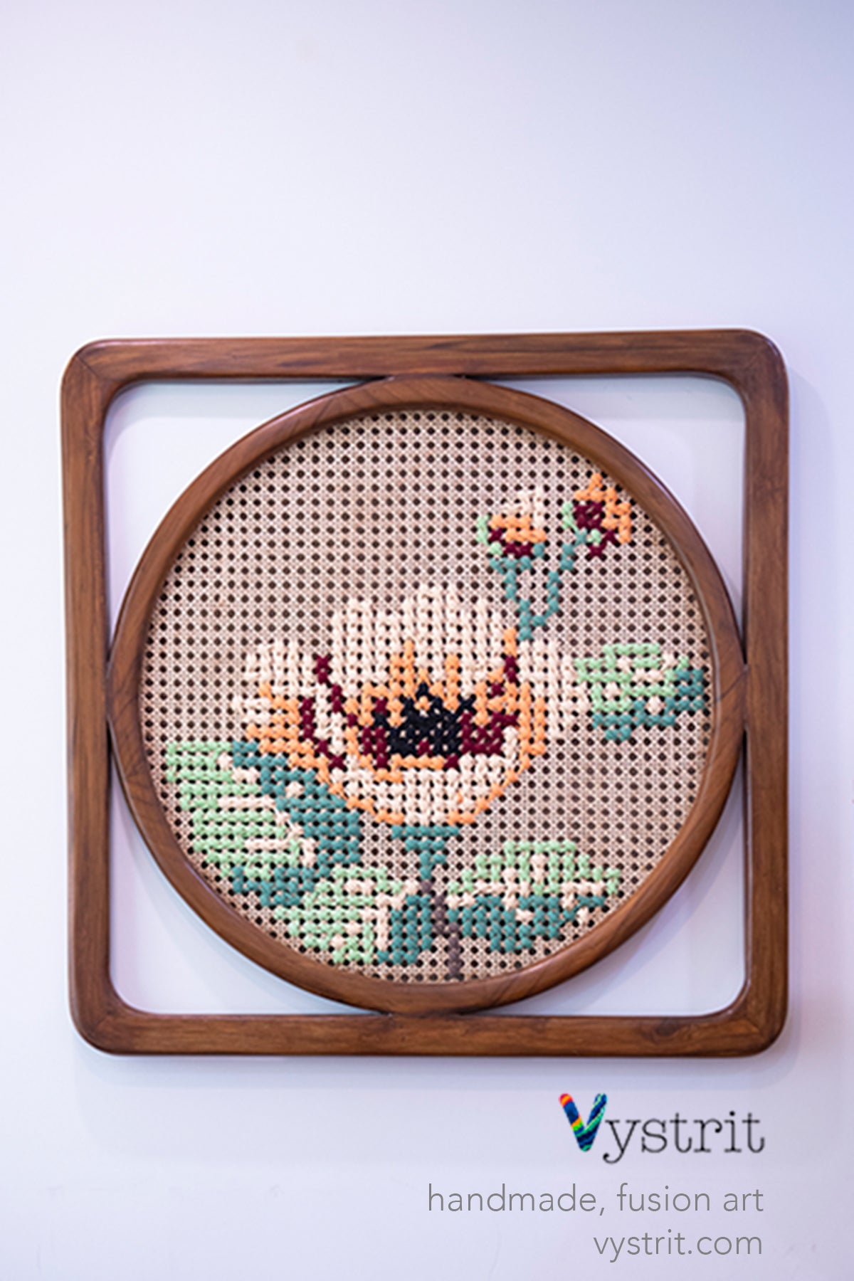 - Material: Handmade Teak wood frame, natural star pattern rattan mesh (cane webbing), textile/ threads