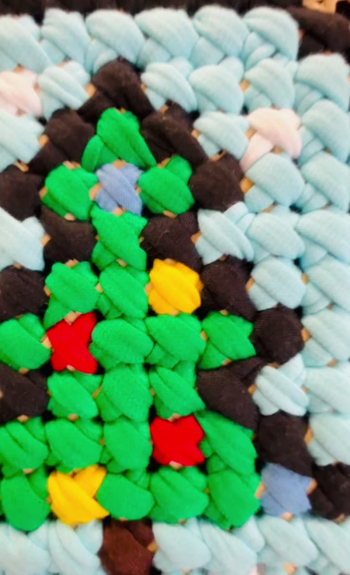 A delightful and festive depiction of a Christmas tree encased in a magical blue glass globe, with delicate snowflakes falling all around. This charming artwork is crafted with intricate hand-stitching on natural rattan mesh, bringing the holiday spirit to life. The tree is adorned with vibrant details, nestled inside the translucent blue globe, evoking the joy and warmth of the season. This mixed-media textile art is a perfect celebration of Christmas, blending creativity and craftsmanship into a captivating piece.