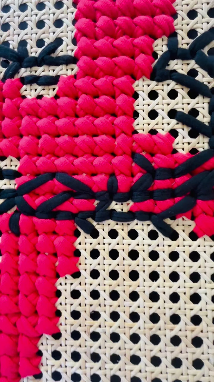 Material: Handmade Teak wood frame, natural star pattern rattan mesh (cane webbing), textile/threads