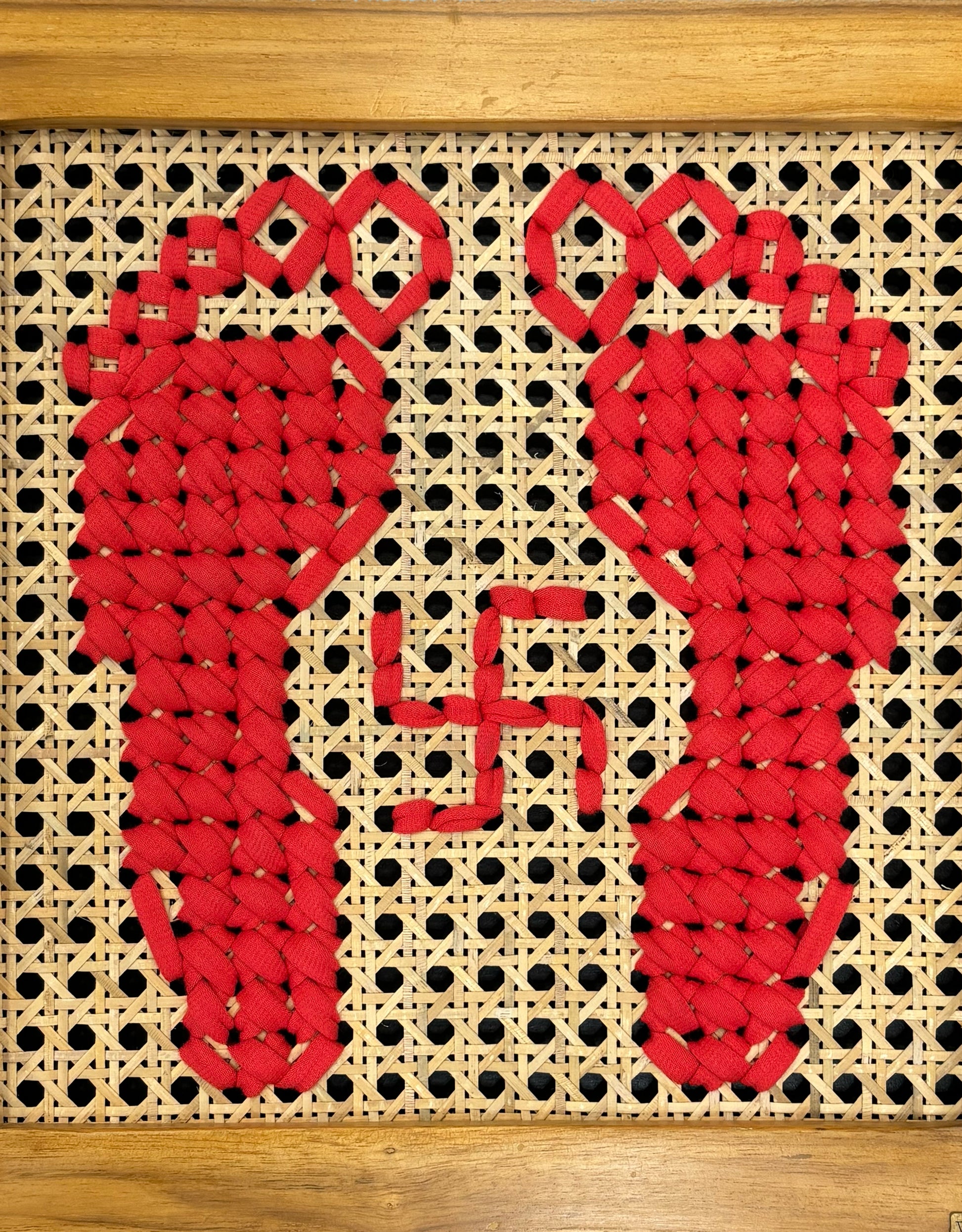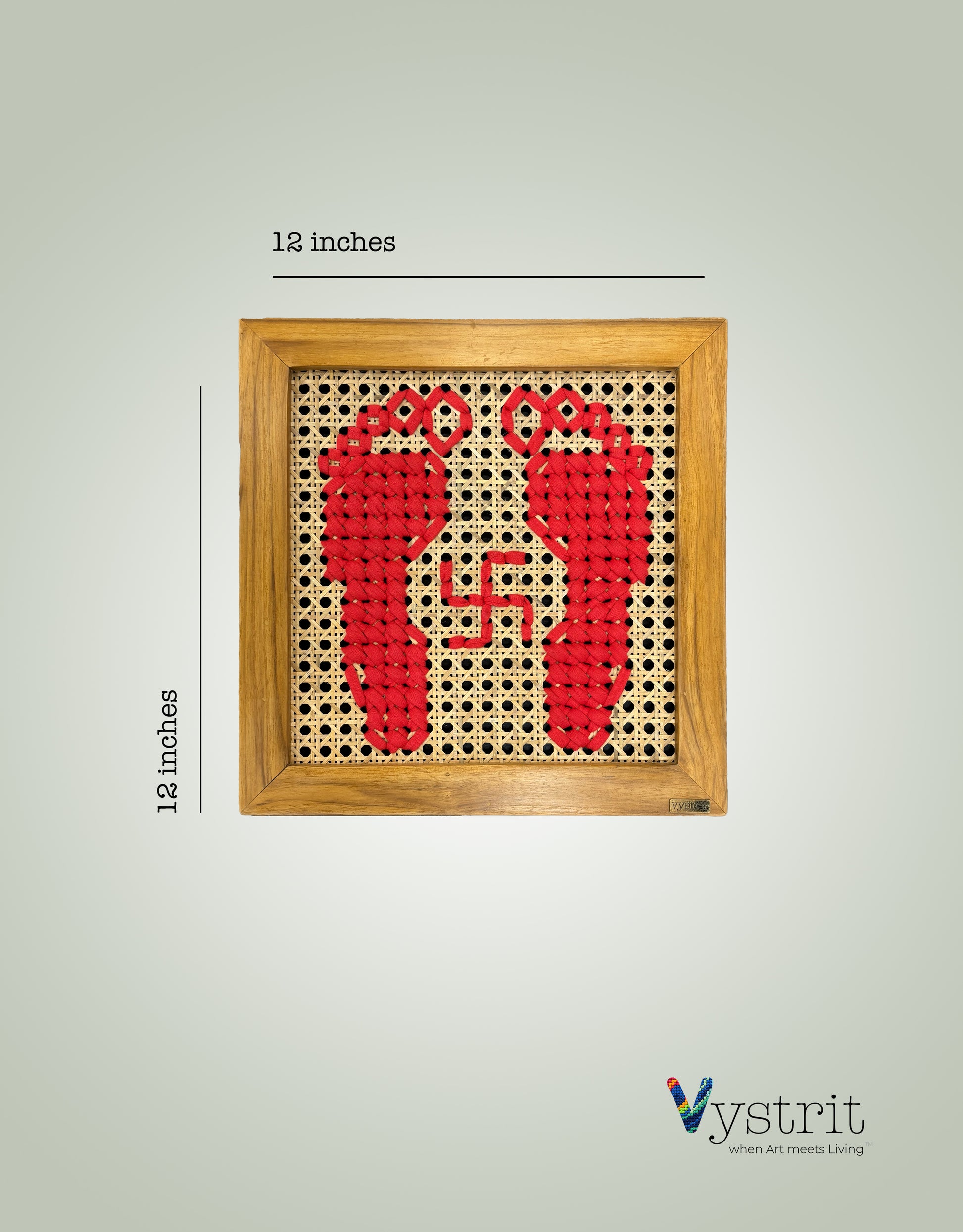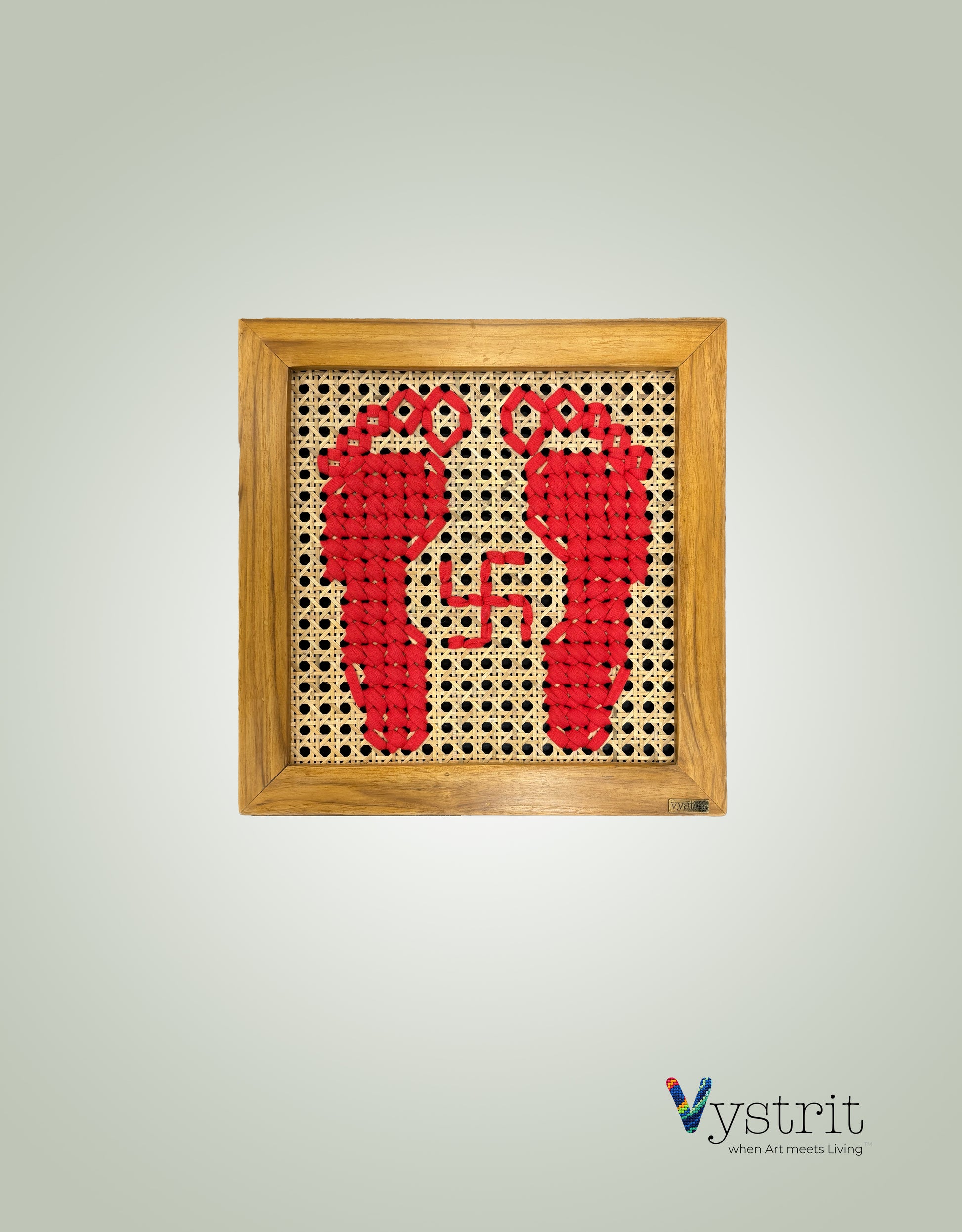 A divine depiction of Devi Maa's sacred feet, symbolizing purity, strength, and eternal protection. The feet are beautifully intertwined with a swastik, representing harmony, good fortune, and auspicious blessings.