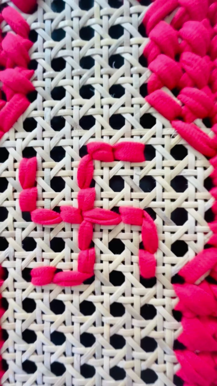 Material: Handmade Teak wood frame, natural star pattern rattan mesh (cane webbing), textile/threads