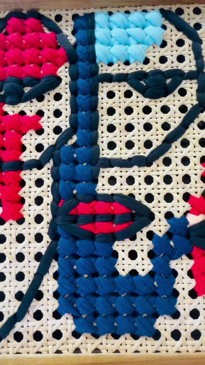 - Material: Handmade Teak wood frame, natural star pattern rattan mesh (cane webbing), textile/ threads