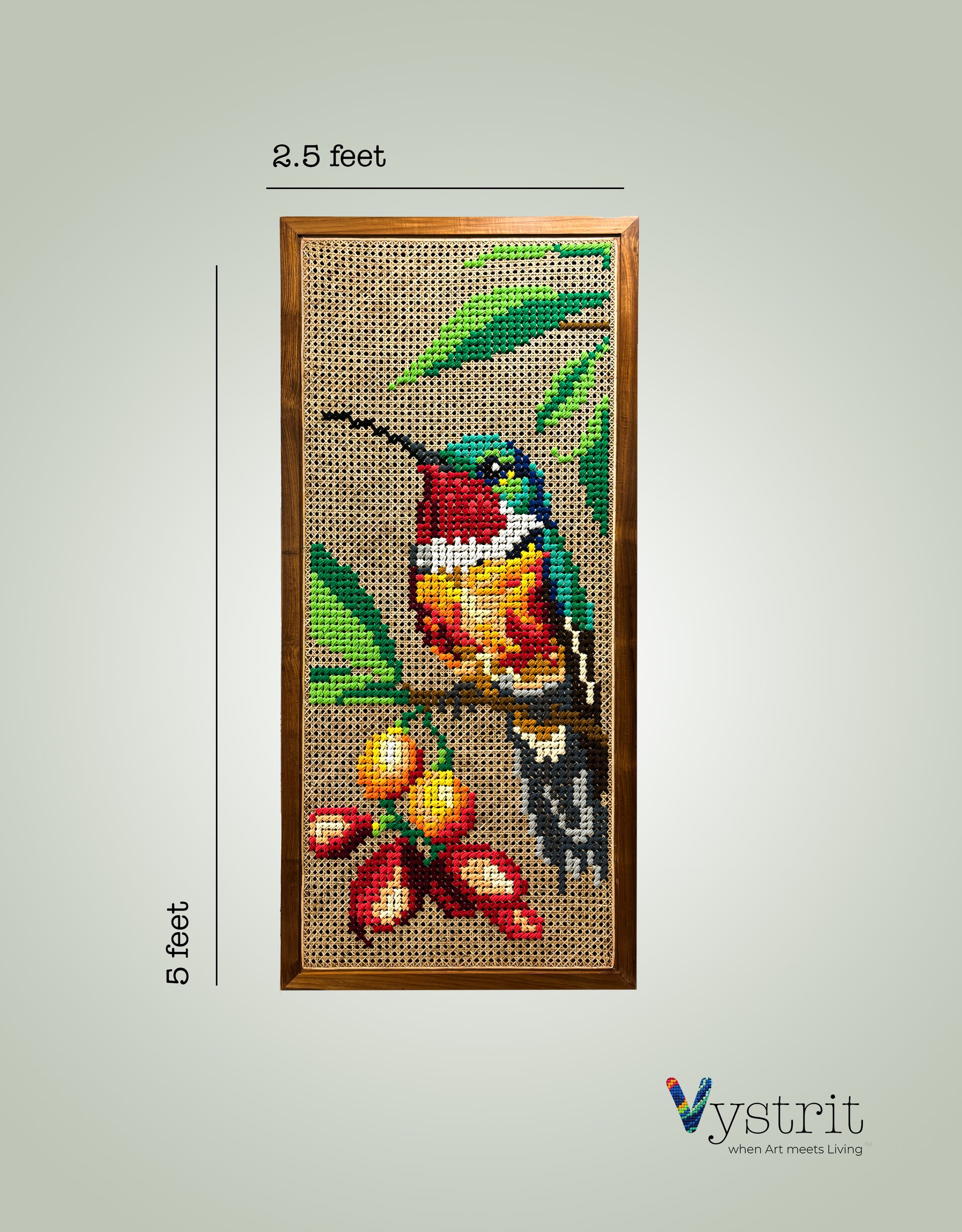 Material: Premium handcrafted Walnut wood frame reinforced with concealed steel frame, handwoven cane webbing, and mixed textile art embroidered onto canvas