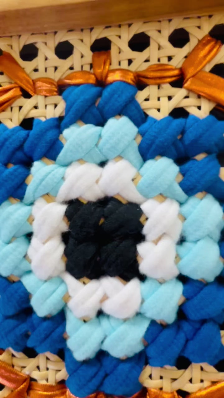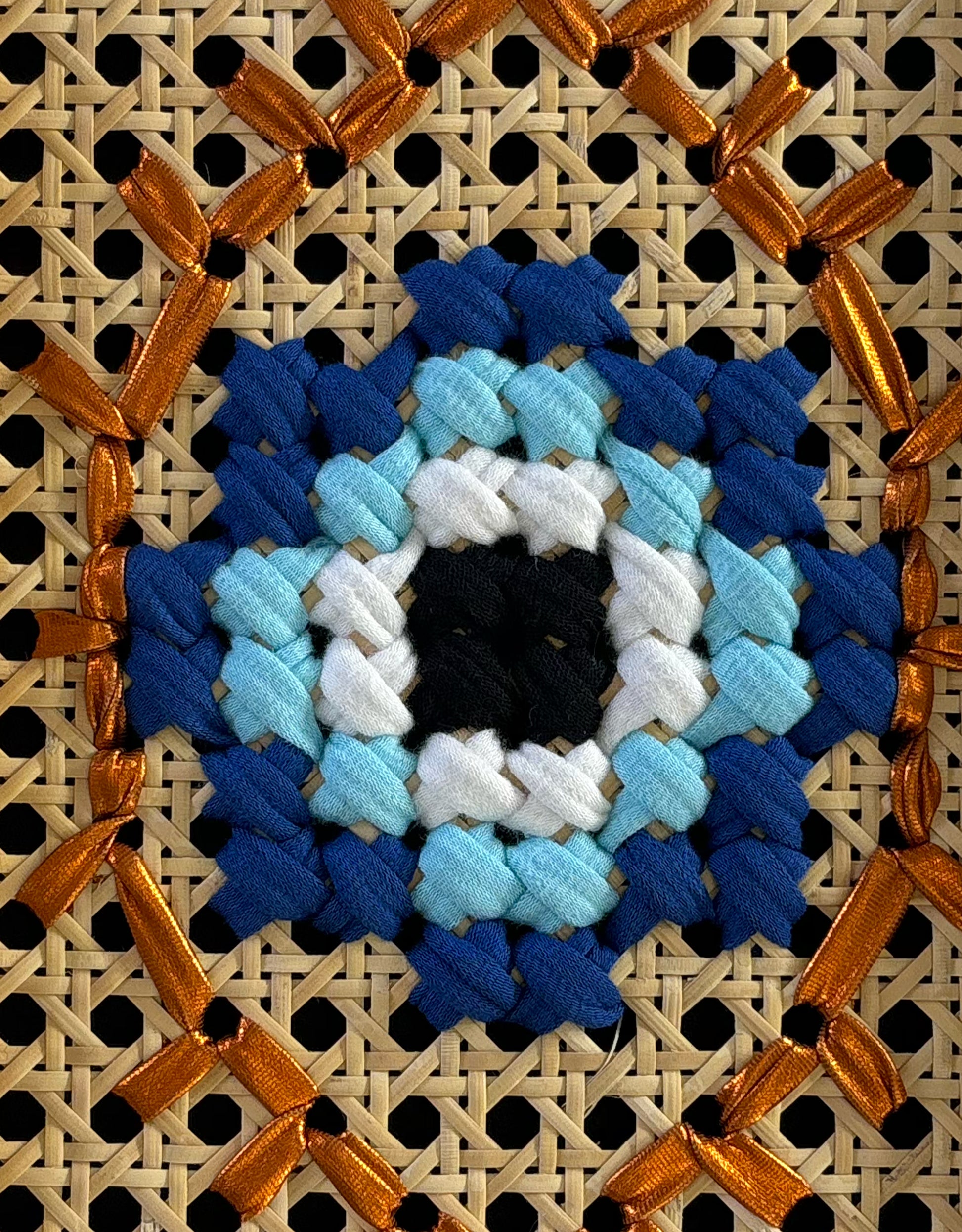 Art: Mixed textile art hand-stitched on cane webbing