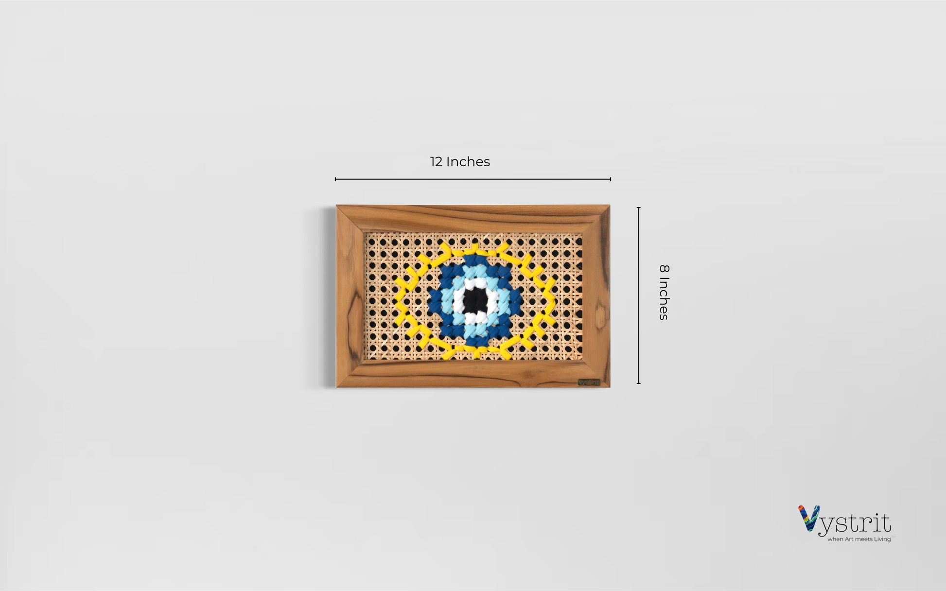"A striking representation of the evil eye, symbolizing protection and warding off negativity. This artwork features bold colors and intricate patterns, meticulously hand-stitched to create a captivating focal point that embodies strength and serenity."