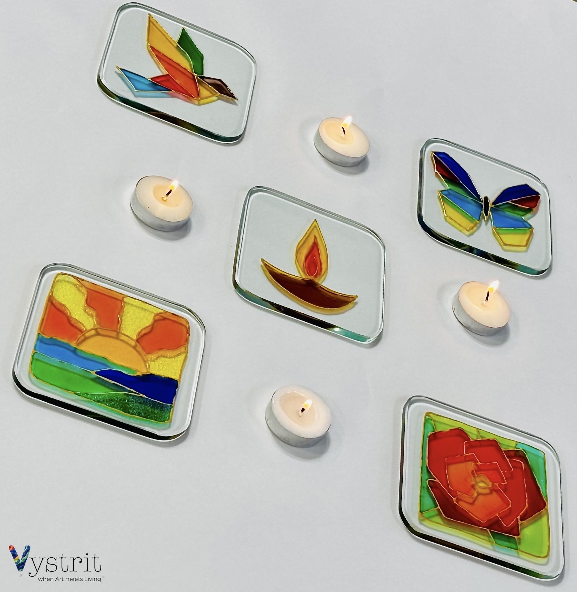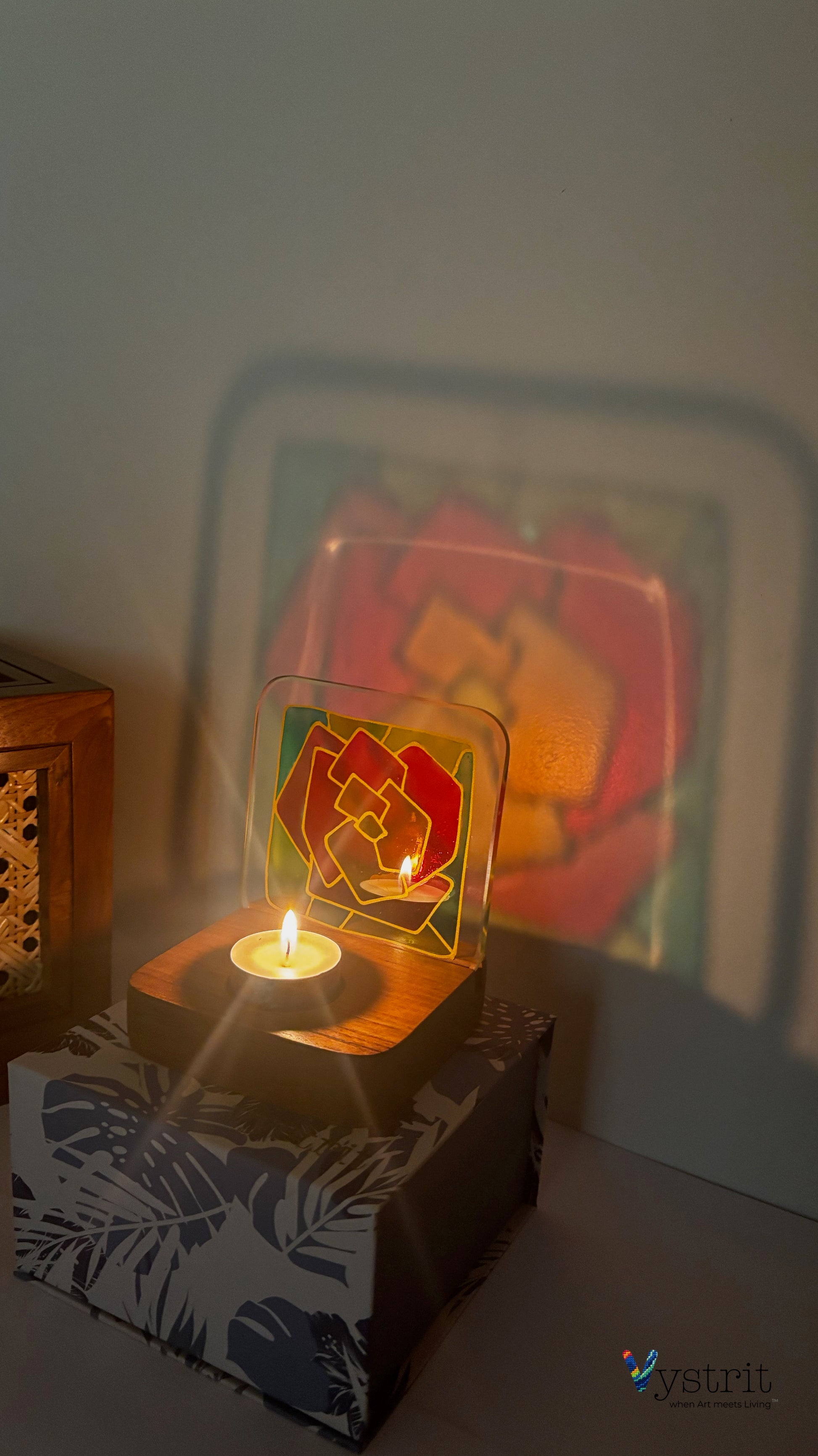Elevate your space with this exquisite set of teakwood tea light candle holders featuring hand-painted glass art inserts. Crafted from ethically sourced teakwood, the set includes up to five hand-painted glass inserts that nestle perfectly into the teakwood stand, blending art and functionality seamlessly.