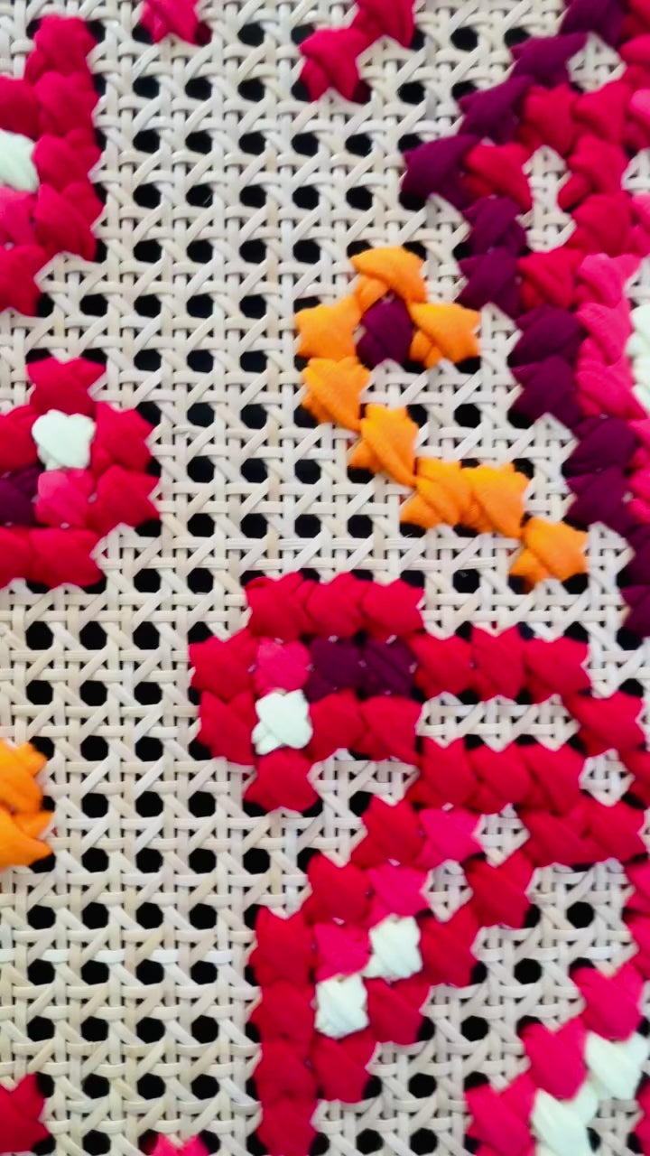 - Material: Handmade Teak wood frame, natural star pattern rattan mesh (cane webbing), textile/ threads
