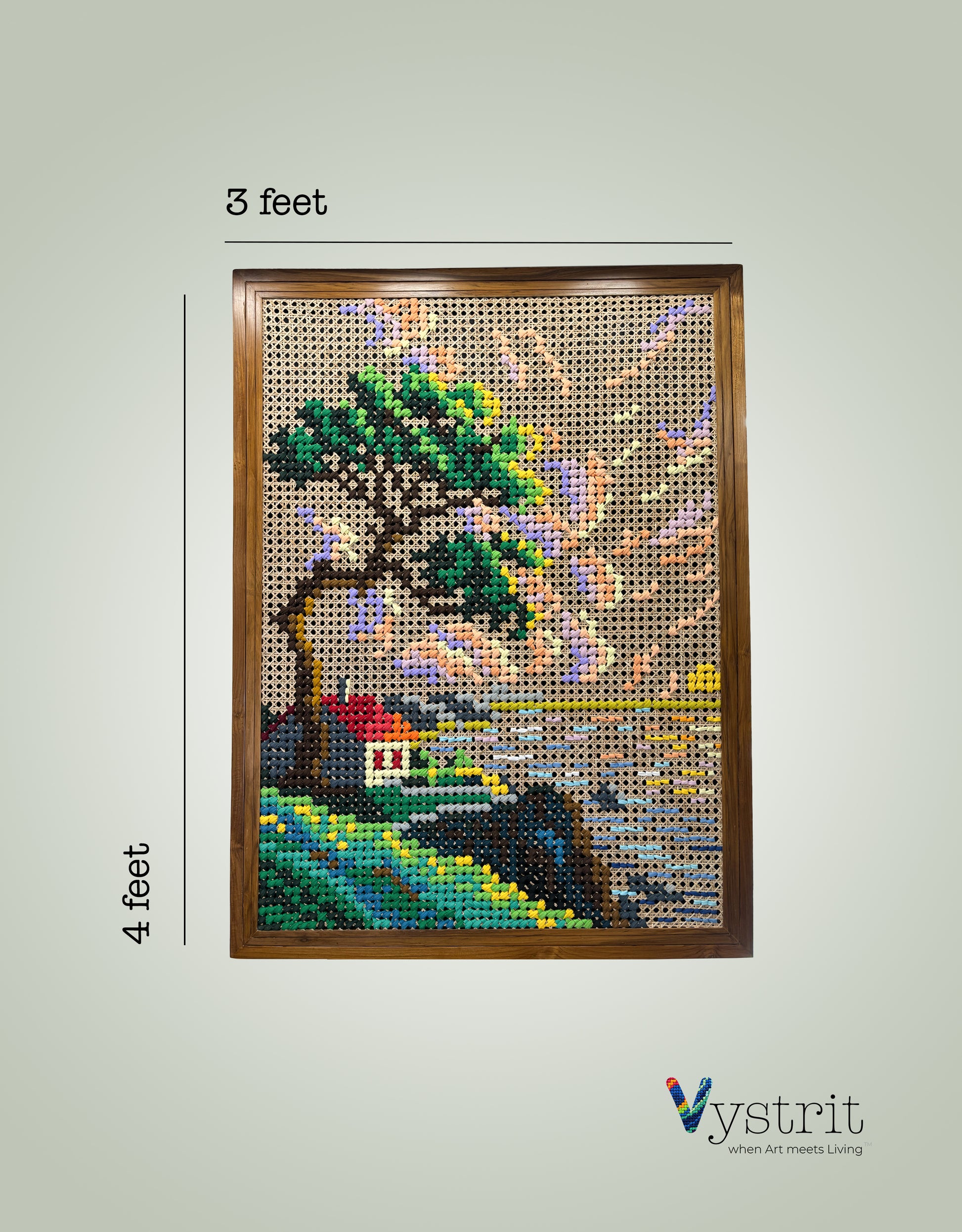 Finer details: Notice the intricately detailed shingles on the house’s roof and the textured bark of the tree, which add depth and character to the piece. A soft trail leads up to the house, disappearing into the greenery, while the mountains in the background stand tall, bathed in a gentle haze, symbolizing serenity and timelessness.