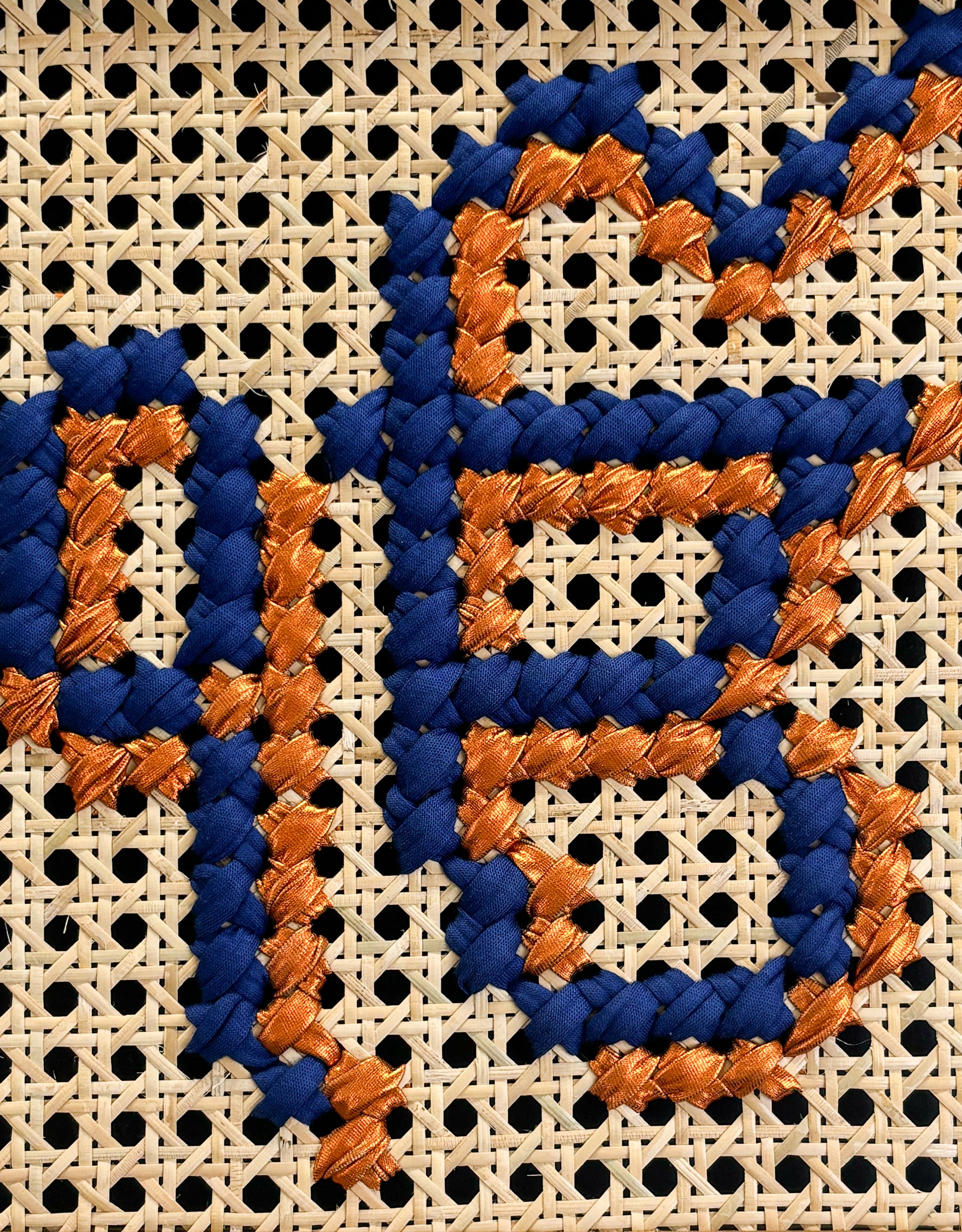 Art: Mixed textile art hand-stitched on cane webbing