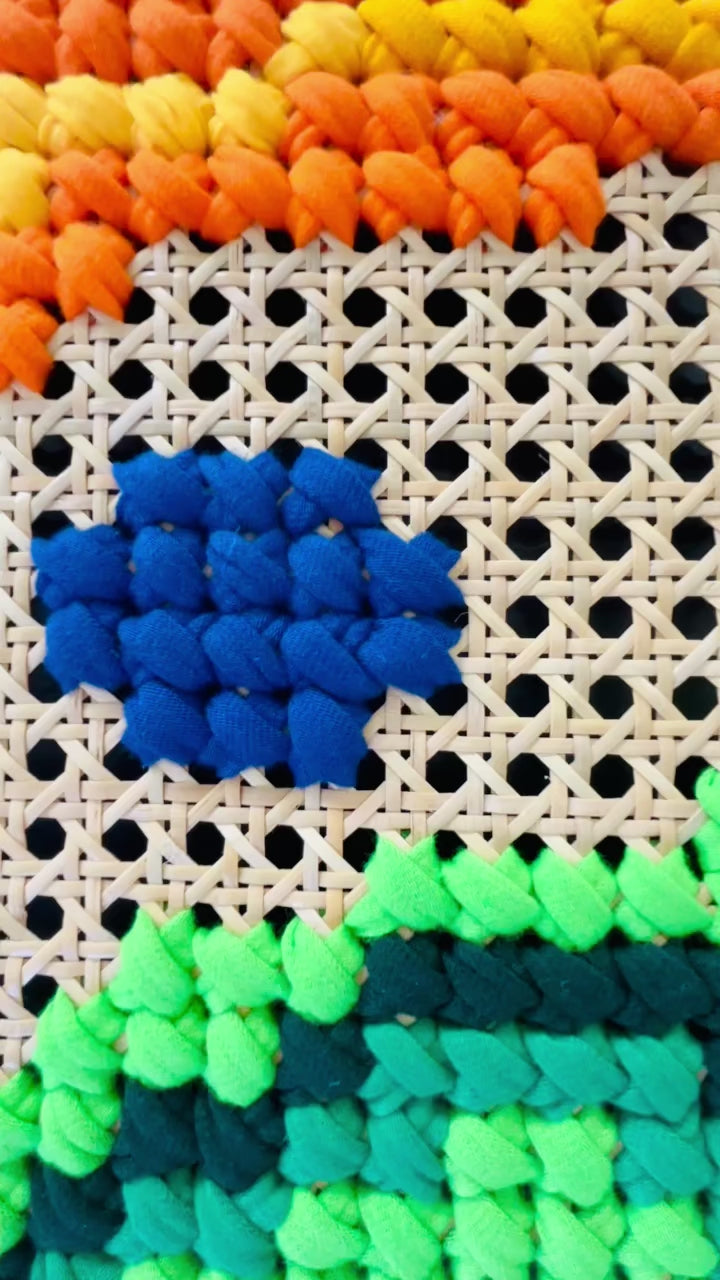 - Material: Handmade Teak wood frame, natural star pattern rattan mesh (cane webbing), textile/ threads