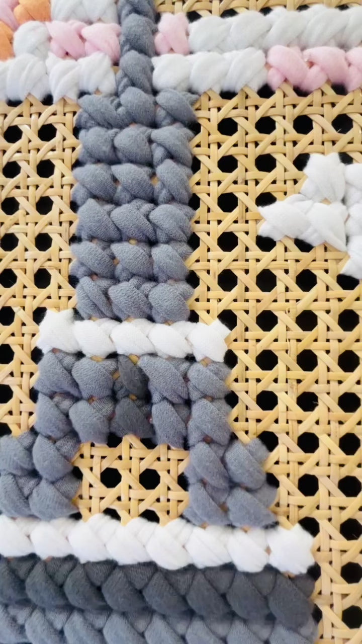 - Material: Handmade Teak wood frame, natural star pattern rattan mesh (cane webbing), textile/ threads