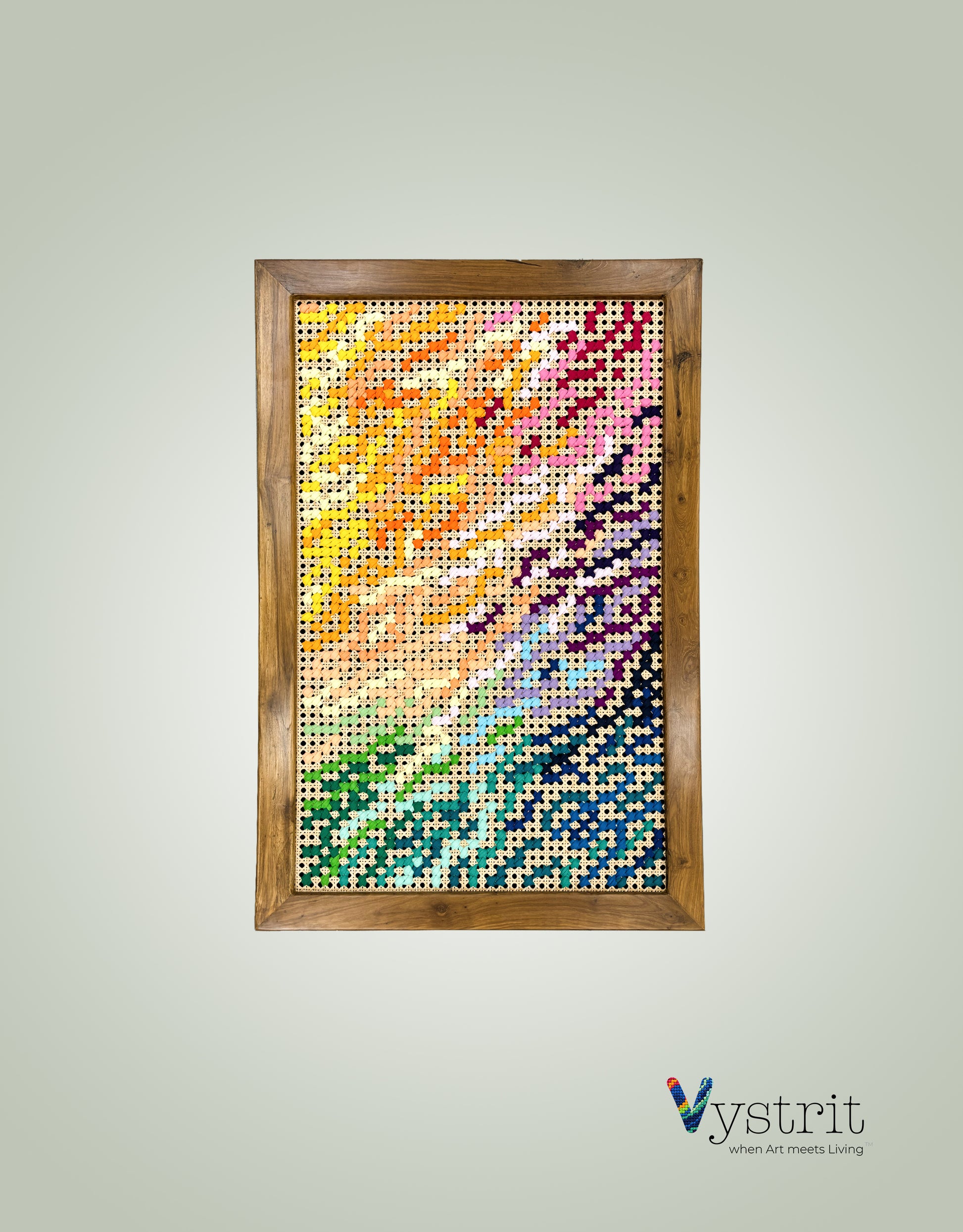 Subtle design, paired with a rich teak wood frame – a fusion art piece that will brighten any room and spark engaging conversations
