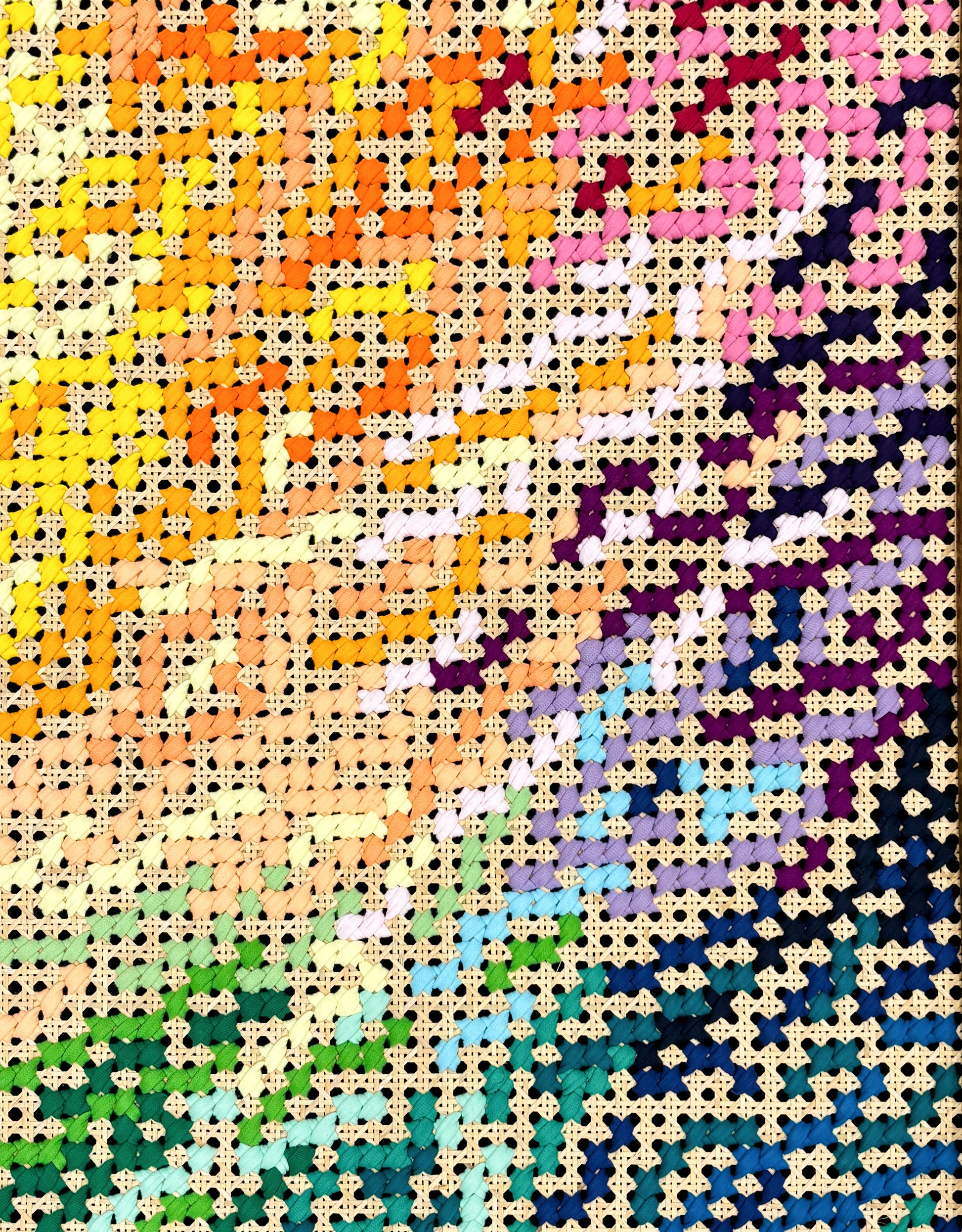 Art: Mixed textile art hand-stitched on cane webbing