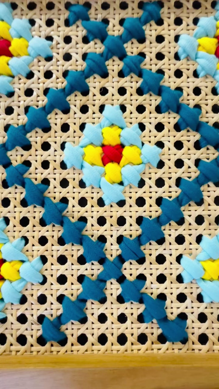 - Material: Handmade Teak wood frame, natural star pattern rattan mesh (cane webbing), textile/ threads