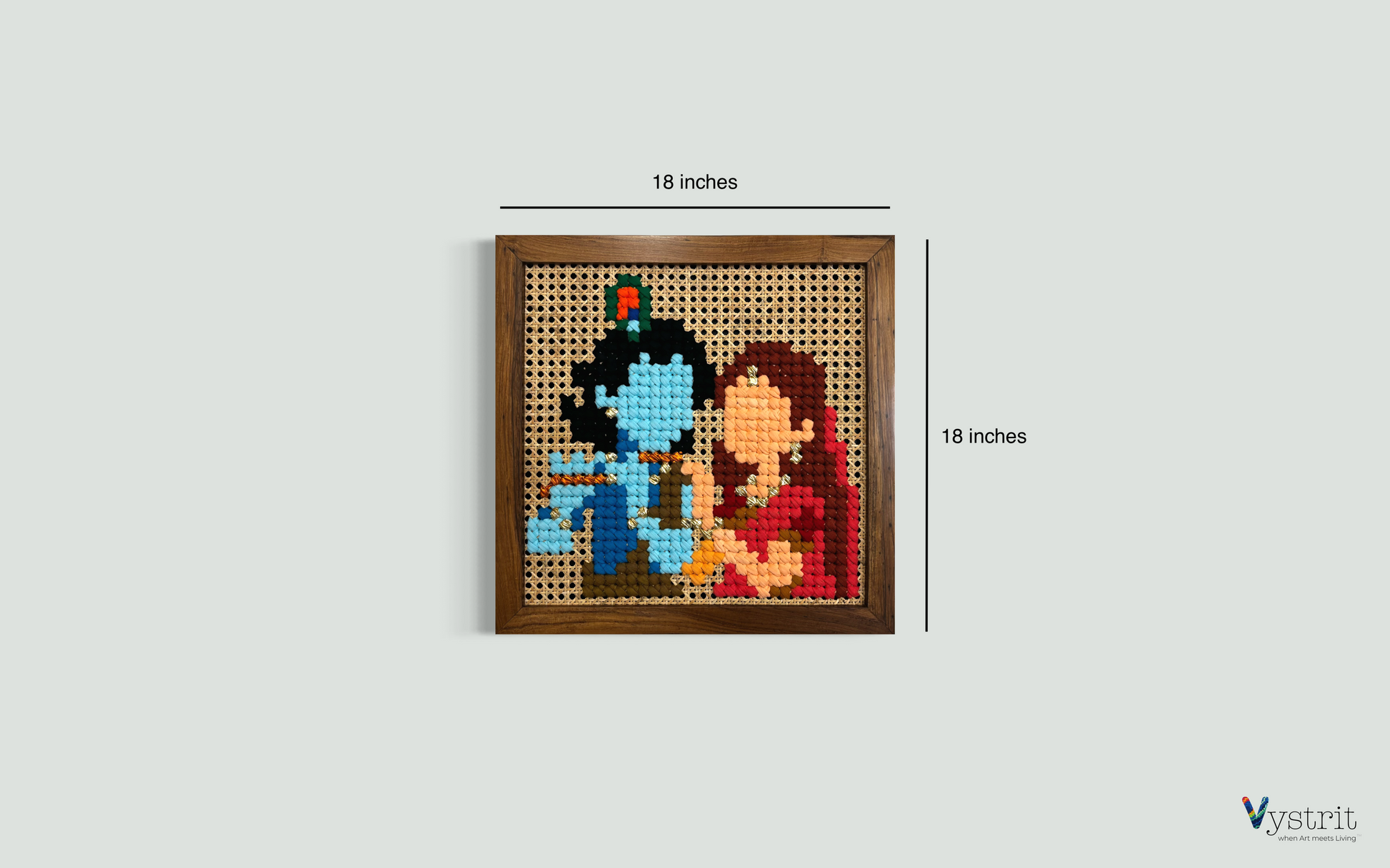 Framed in solid teakwood, this 18x18 inch artwork brings warmth and spiritual presence to any space. As light drifts across the cane and vibrant threads, Krishna & Radha come alive—inviting viewers to reflect on love's poetry, soulful beauty, and the richness of Indian craft. It’s a contemporary heirloom, sure to inspire devotion and conversation alike.