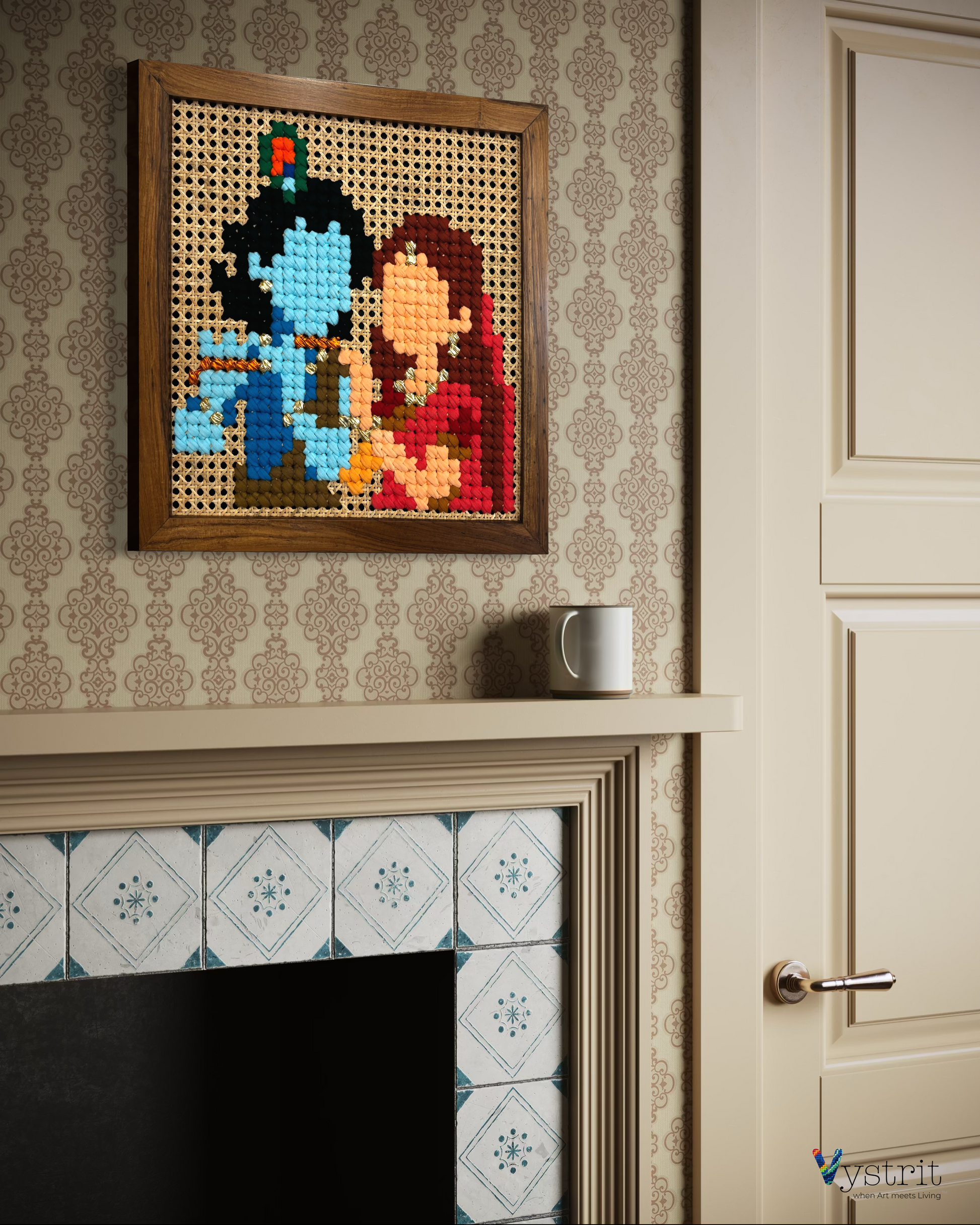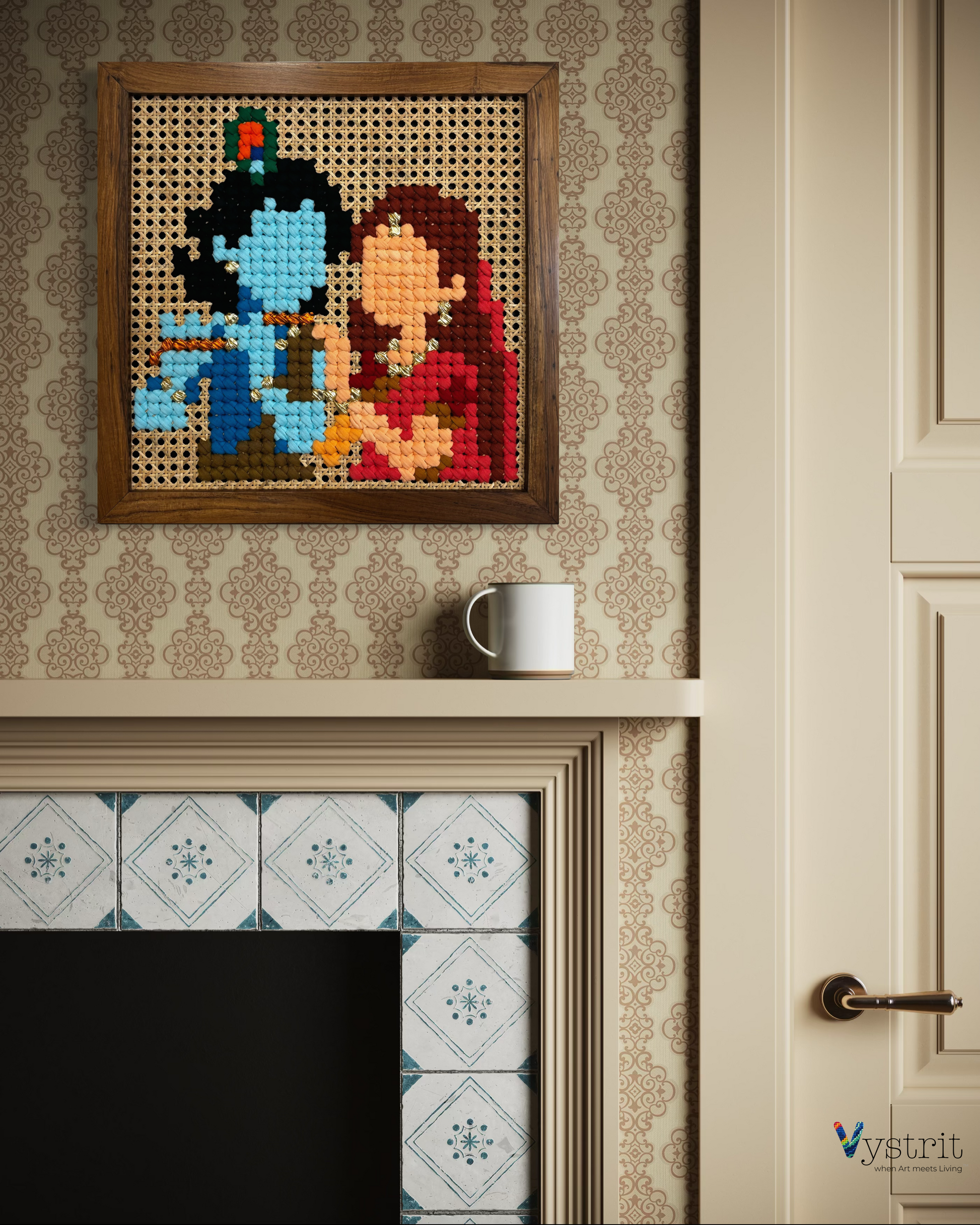 Radha & Krishna captures the eternal dance of devotion and love in a unique, handwoven textile portrait. Using bold, pixel-art stylization, this piece honors the sacred bond between the Krishna—adorned with his peacock feather and flute—and the radiant Radha, crowned in her flowing red saree and golden accents. Each stitch, placed by hand via the traditional Veyari weaving technique on natural rattan cane, weaves together mythology and modern design, creating a textured celebration of artistry and faith.