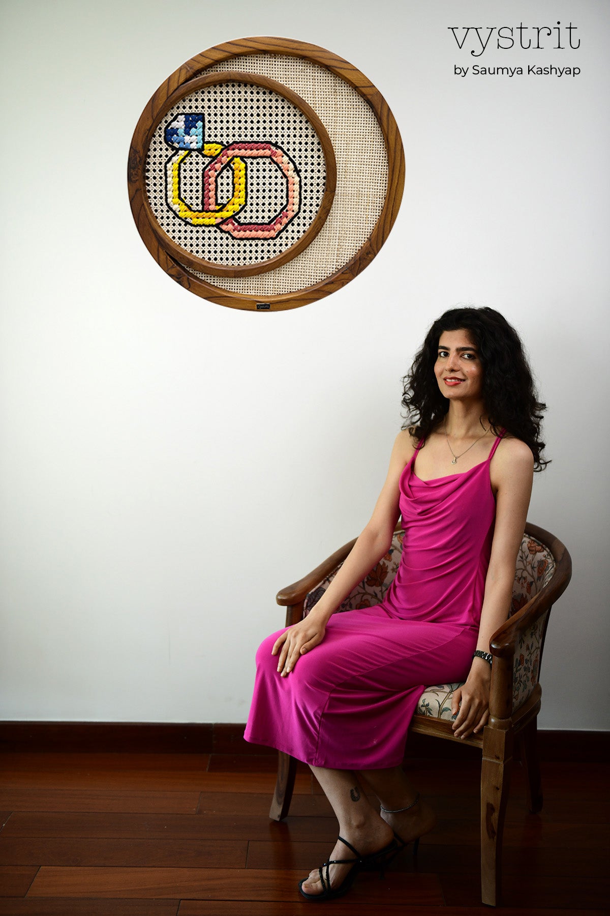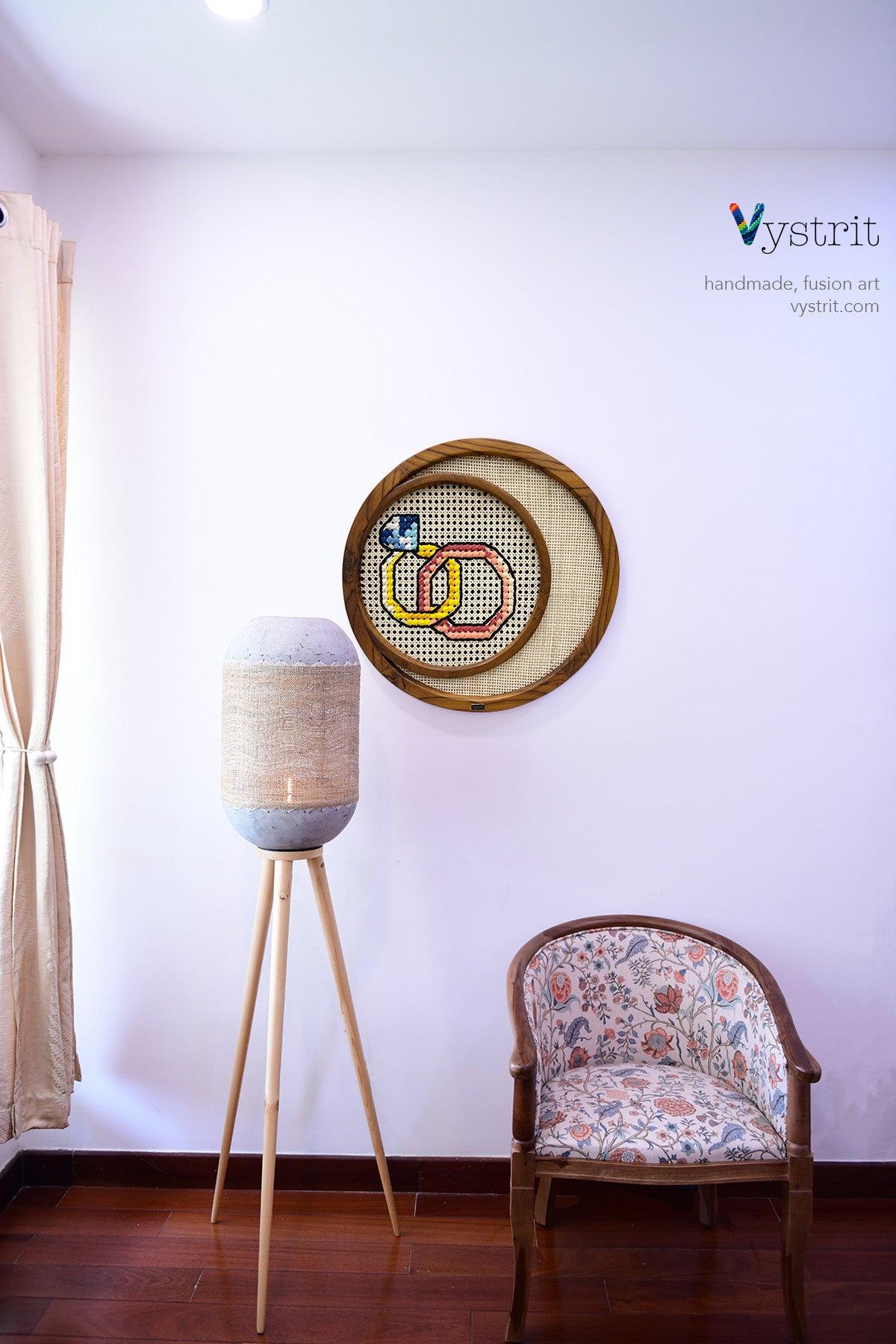 This frame is designed and handcrafted to match this art. It has two circles originating from one edge. Two different natural cane patterns to emphasise and contrast two different circles - symbolising meeting of two individuals who have their individuality, yet they are merging in to become one.