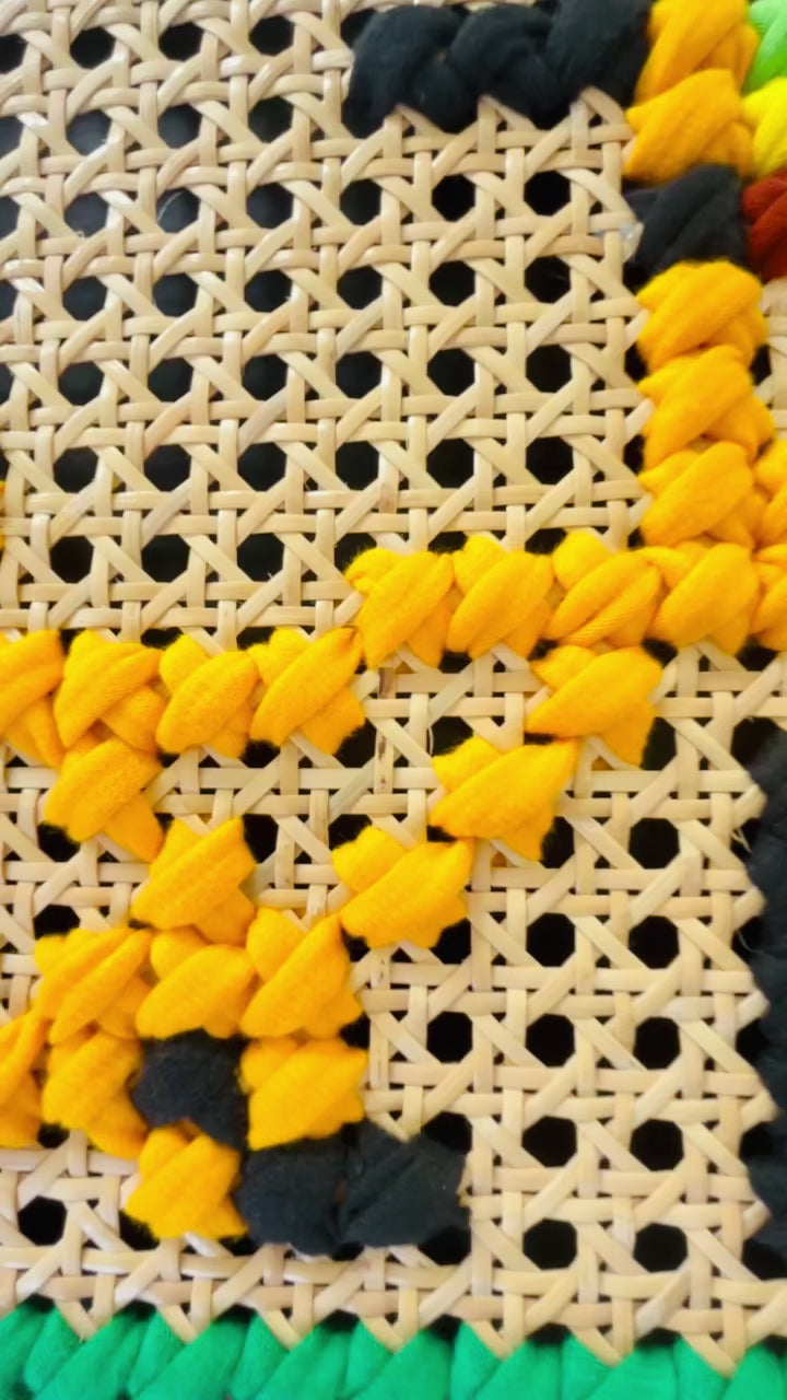 - Art: mixed textile art hand stitched on cane webbing