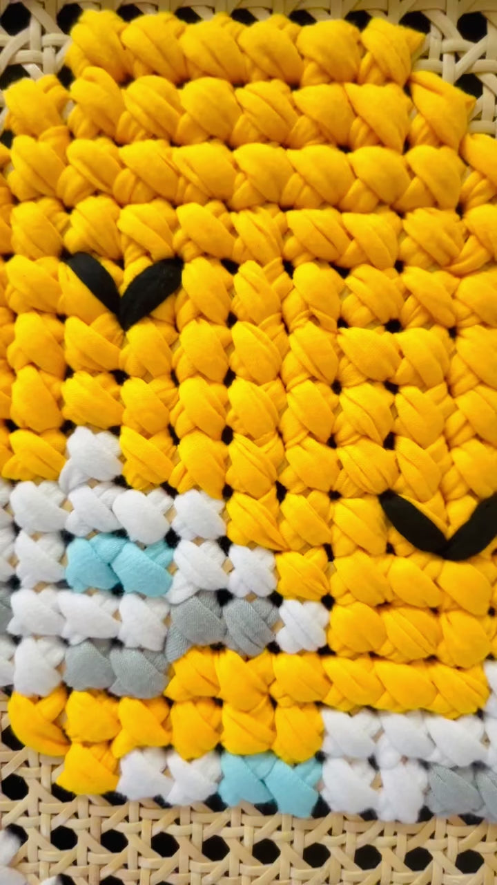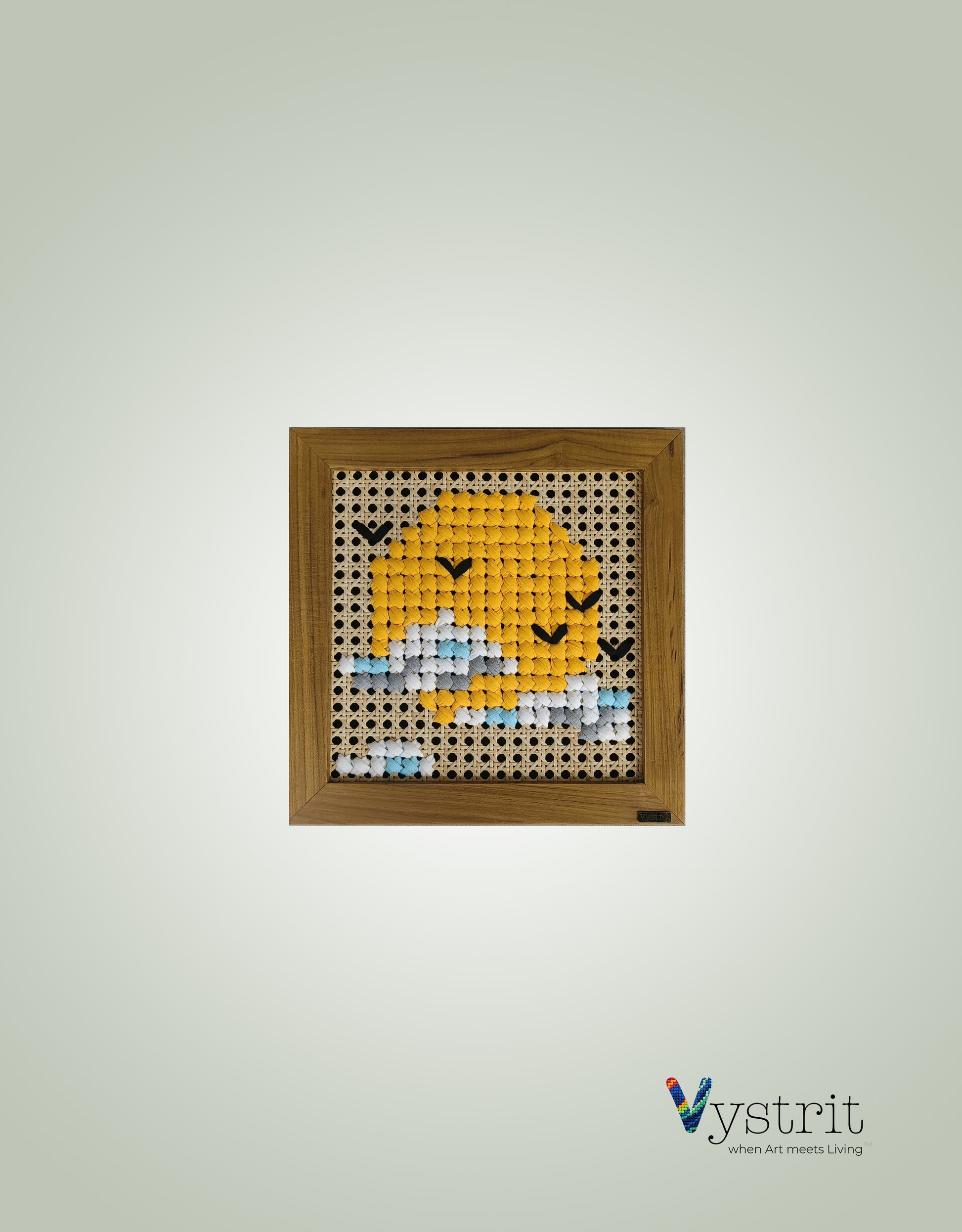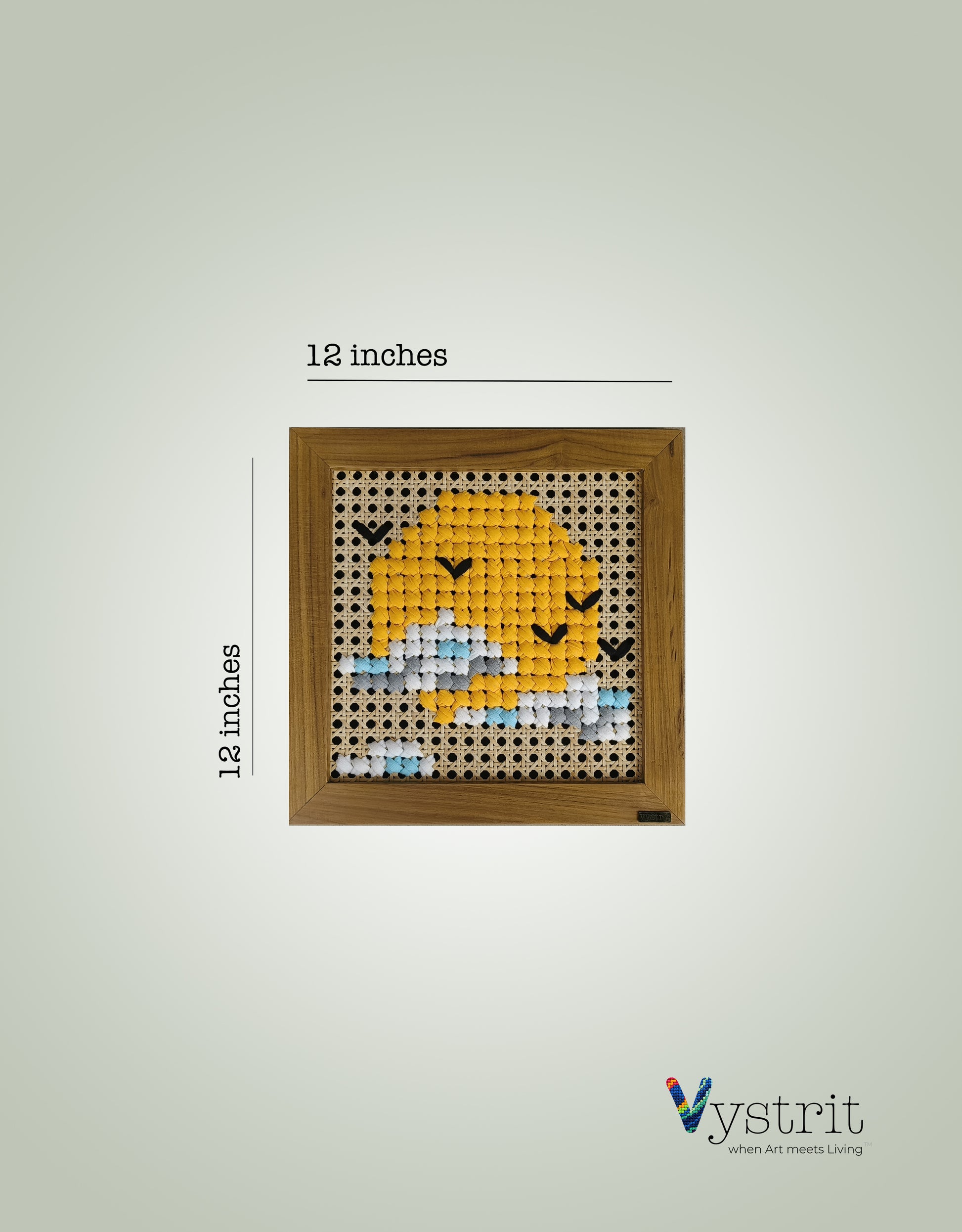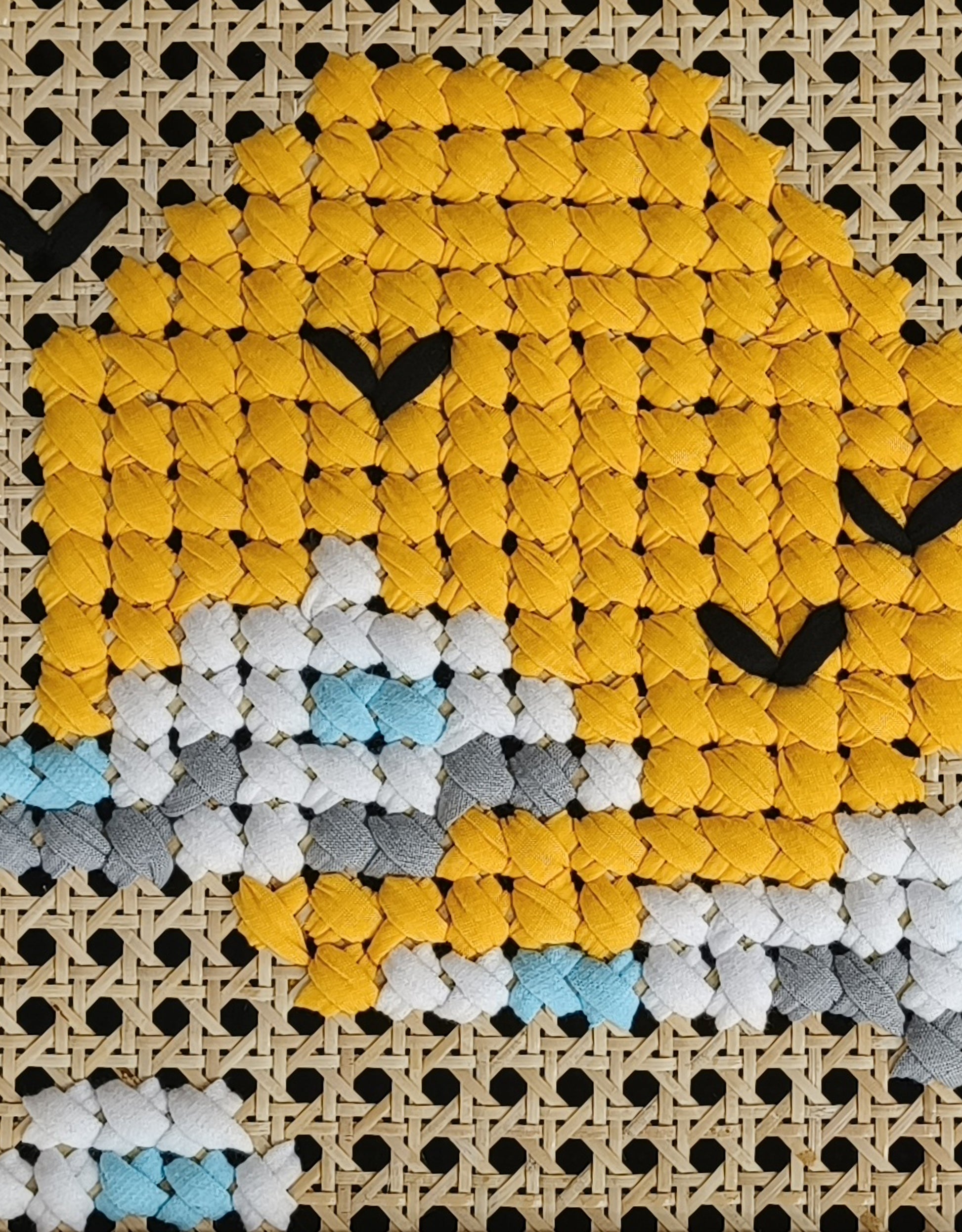 Art: Mixed textile art hand-stitched on cane webbing, with a vibrant sun, birds, and clouds meticulously crafted using colorful threads