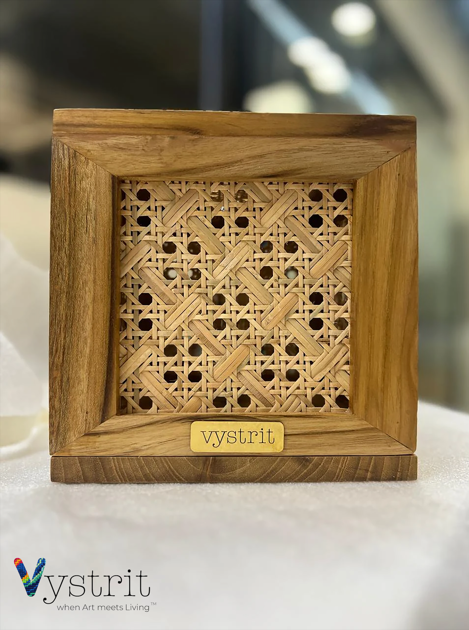Made completely by hand by generational artisans. The base is chiseled out from a single piece of wood. Unique cane design couple with natural teakwood to accentuate your space.