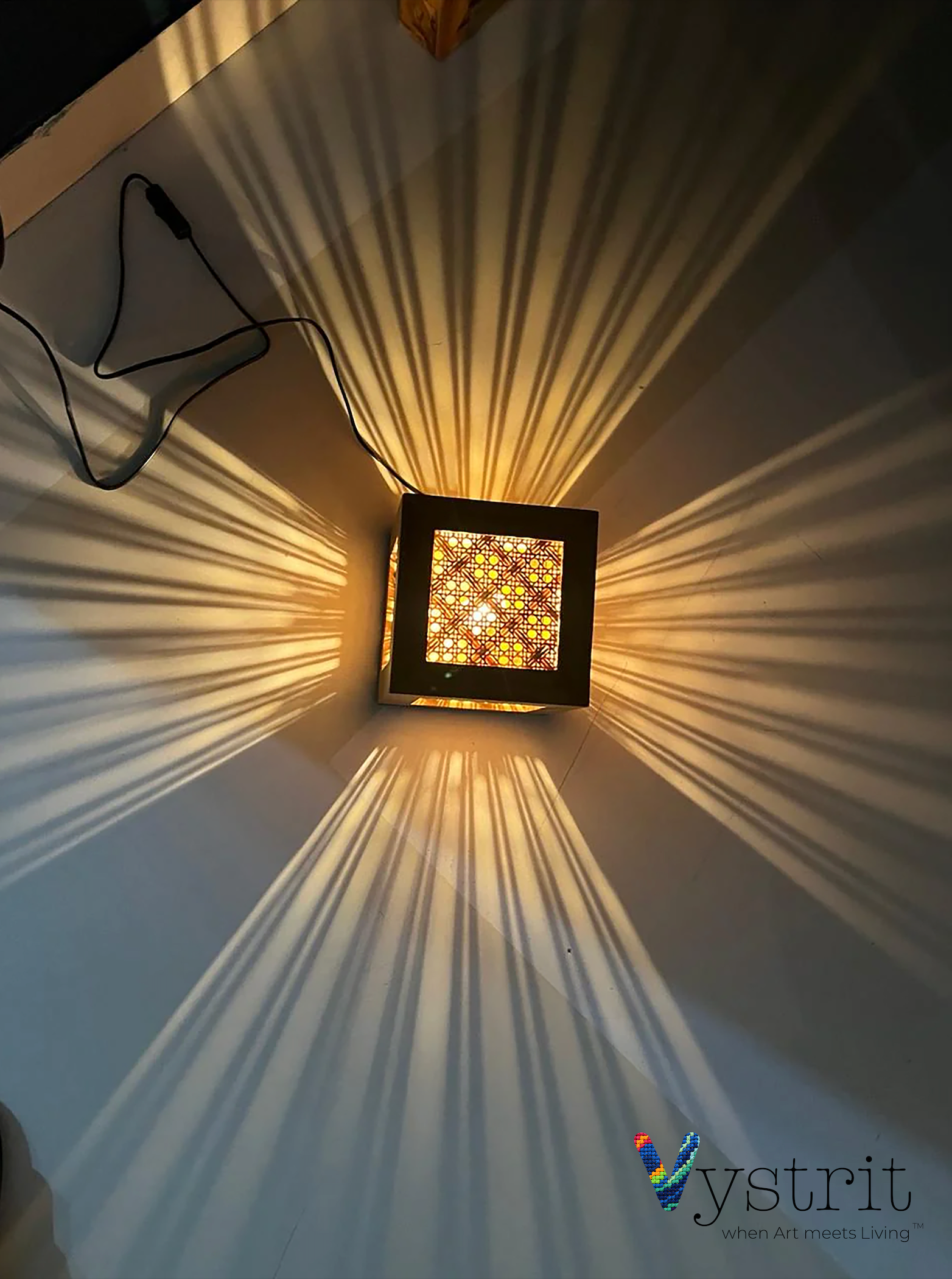Handcrafted Teakwood lamp in a perfect cube of 7". Amazing to look at even when switched off.