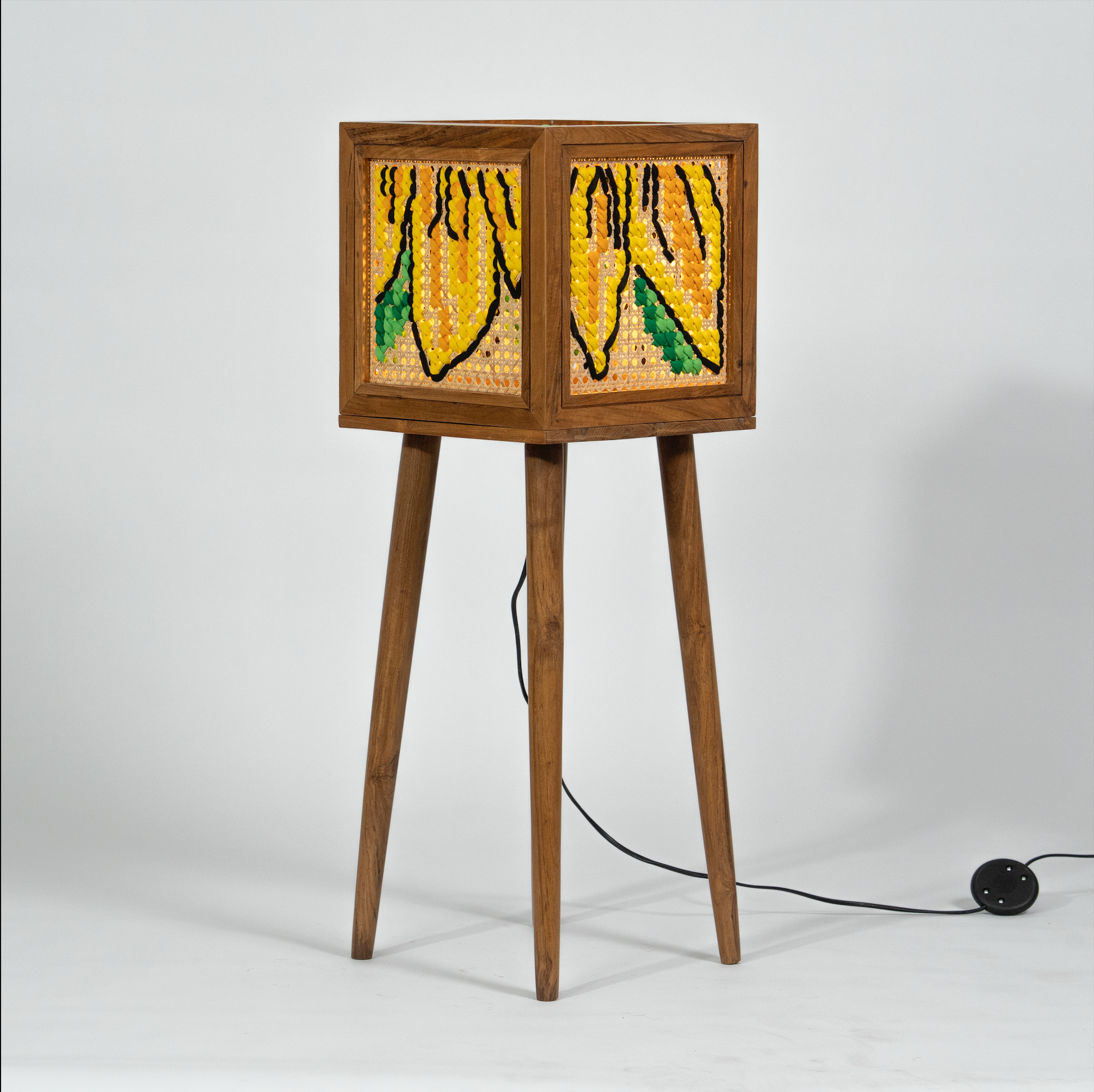 Add a touch of timeless artistry to your space with this teakwood floor lamp, beautifully handcrafted into a tall, graceful form. Its sturdy base, carved from a single piece of wood, tells a story of dedication and heritage. The surrounding cane panels feature detailed textile art, blending texture with tradition.