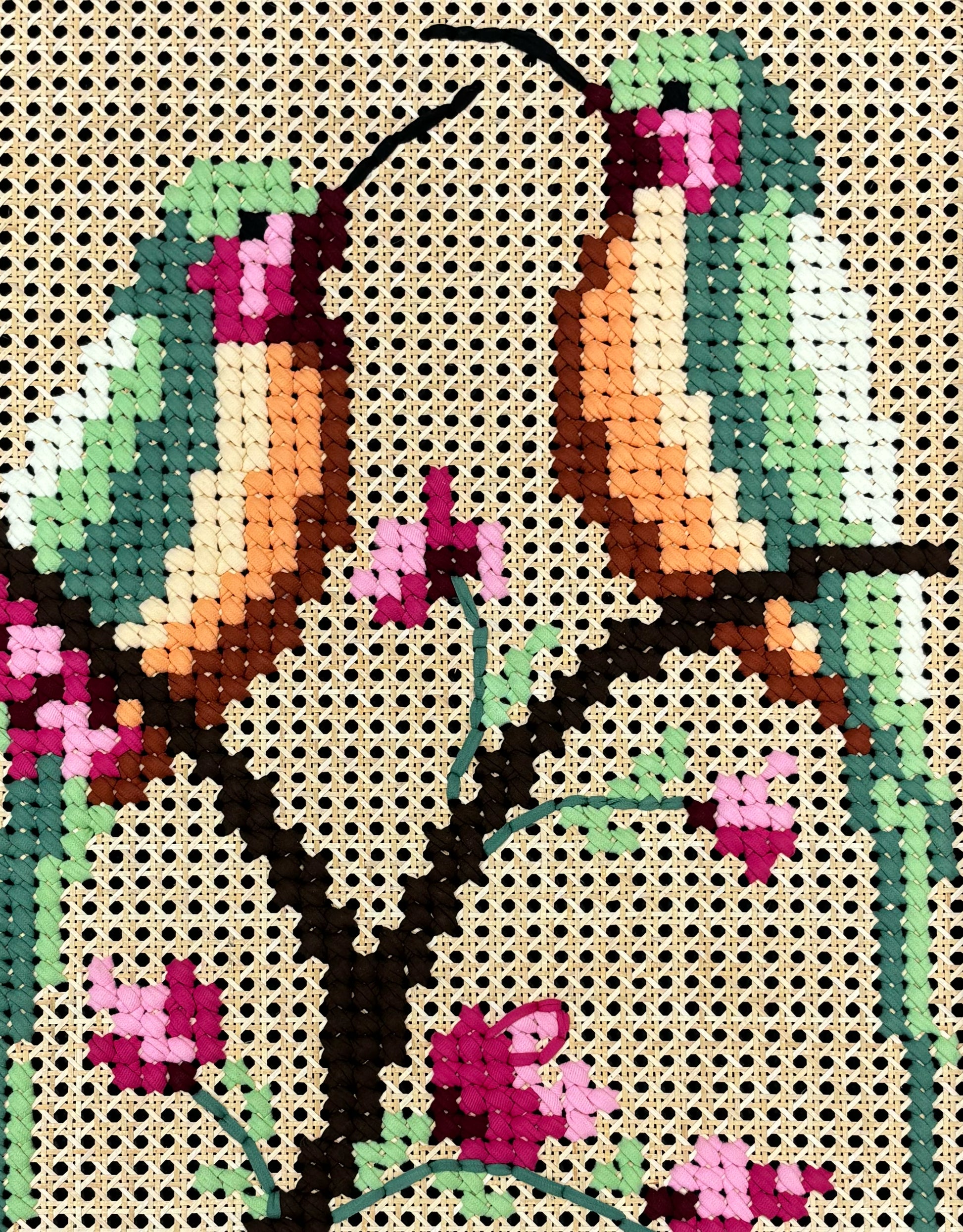 Material: Handmade Teak wood frame, natural star pattern rattan mesh (cane webbing), textile/threads