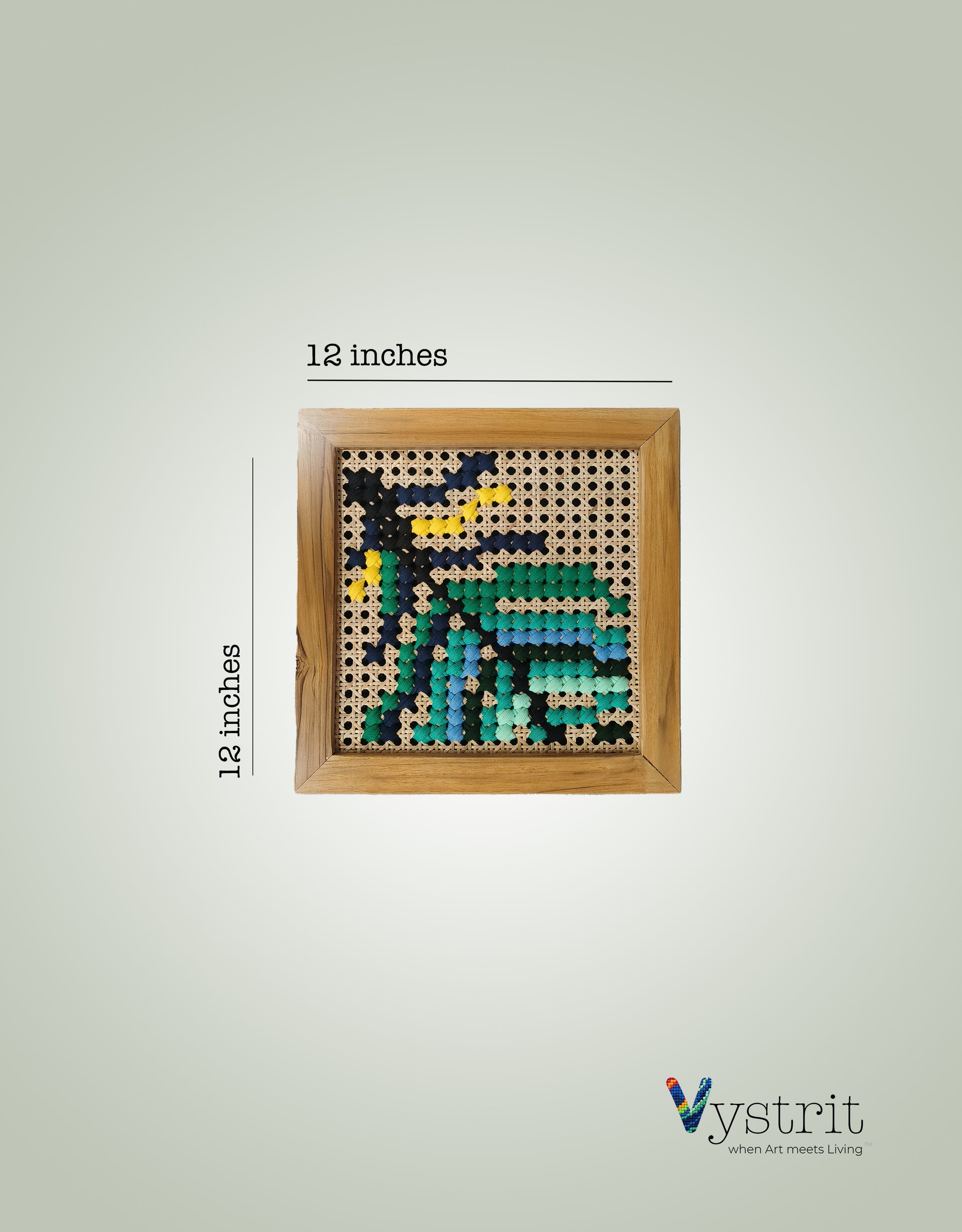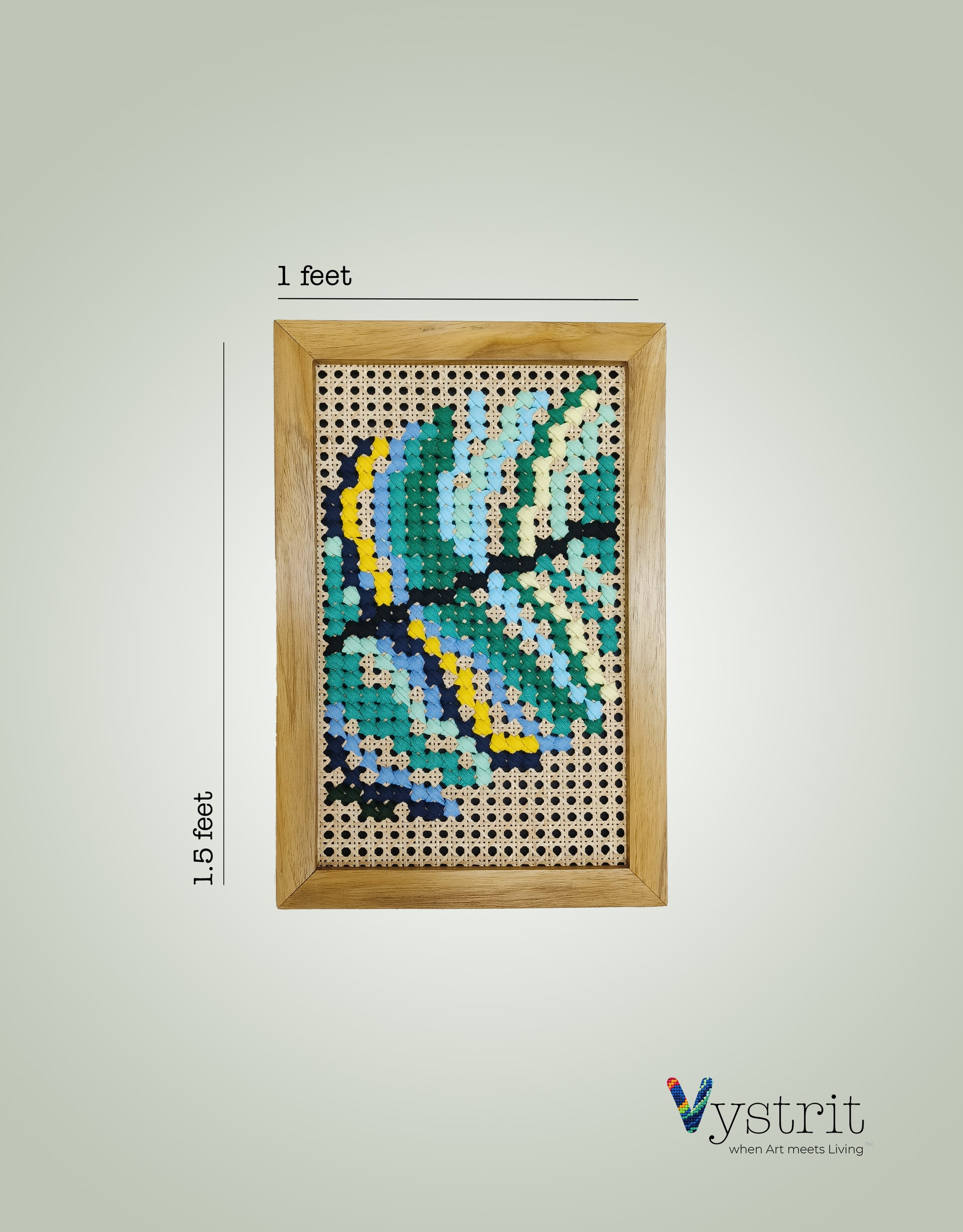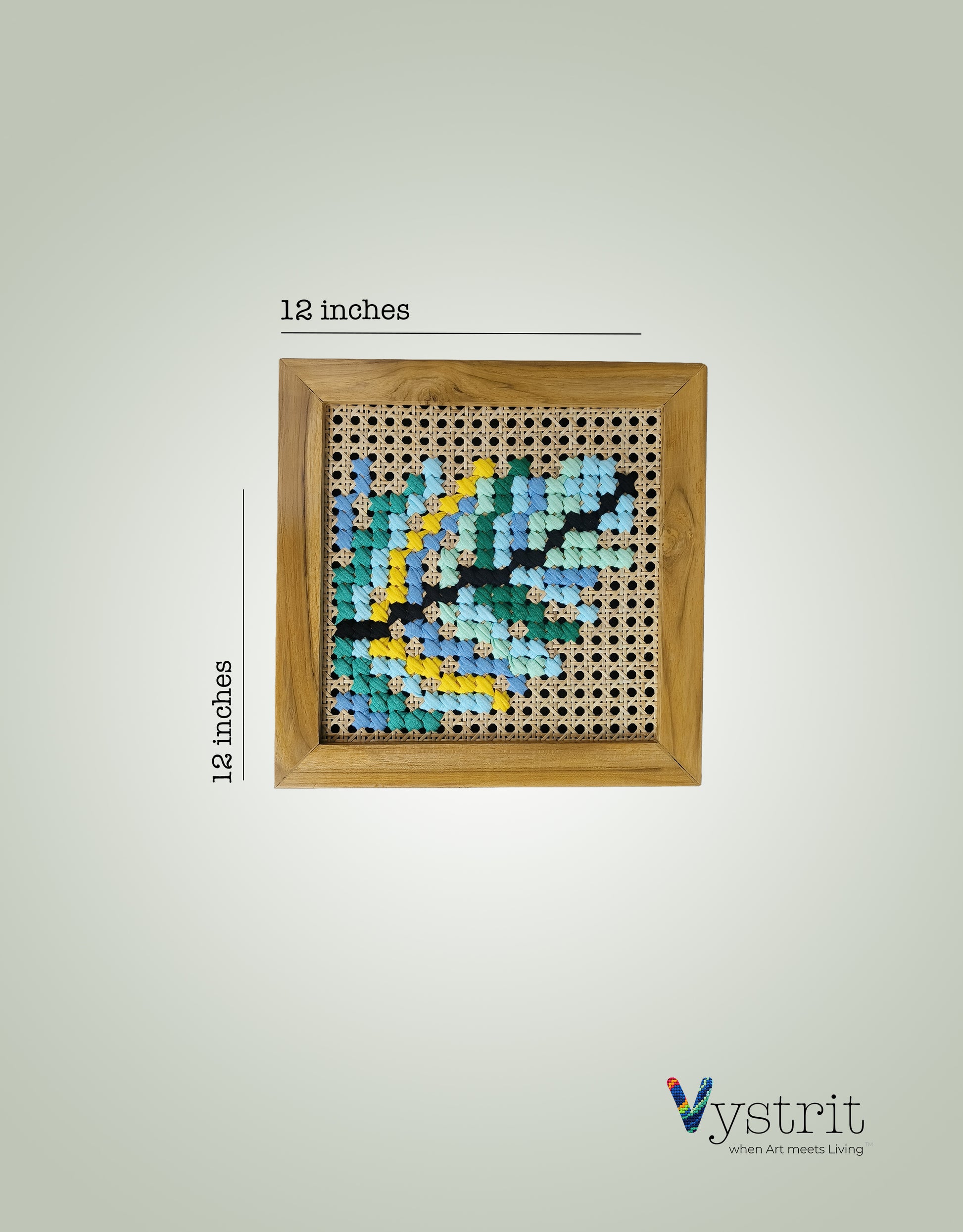 Bring the beauty of nature indoors with this exquisite set of three art frames, each featuring a stunning leaf design in vibrant, unique colors. Crafted with intricate hand-stitching on natural rattan mesh, this set offers a harmonious blend of organic elements and modern craftsmanship. Two frames measure 12 x 12 inches, while the third is a taller piece measuring 12 x 18 inch, creating a dynamic visual composition that adds a natural elegance to any space.