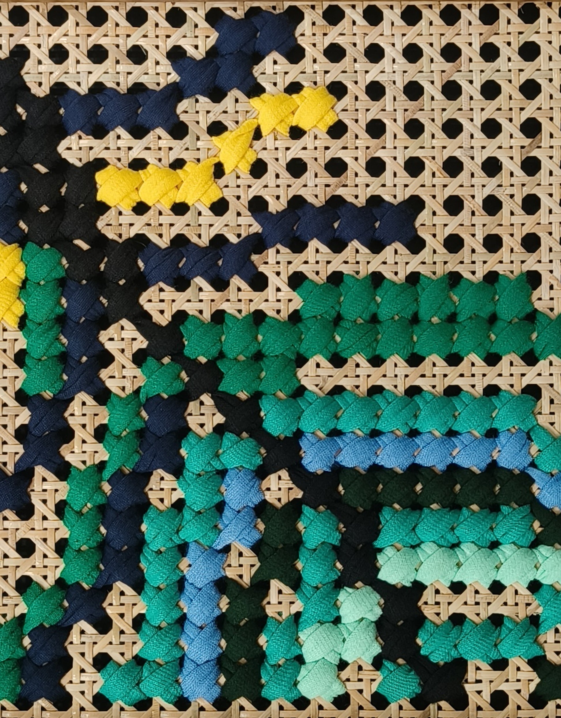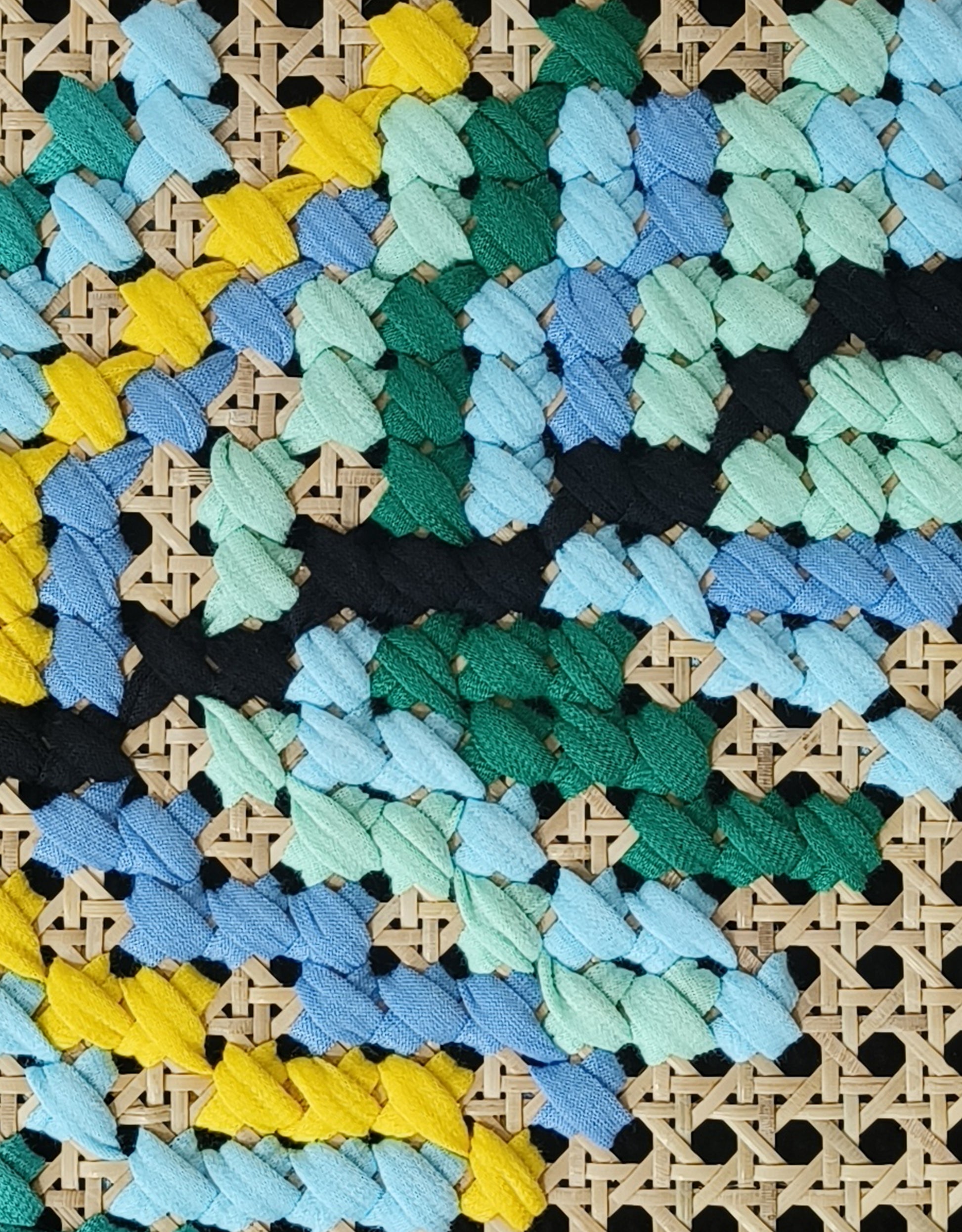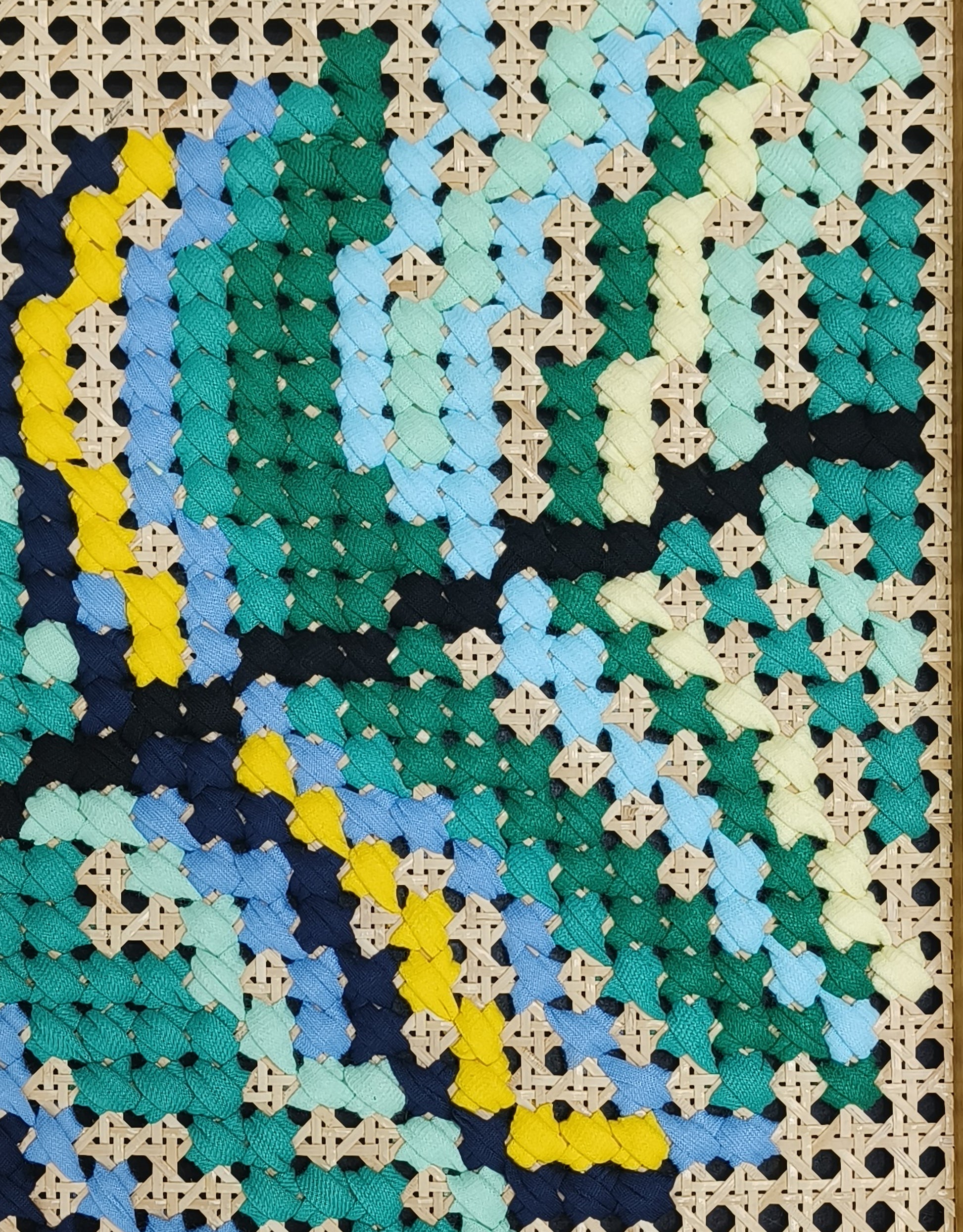 Art: Mixed textile art hand-stitched on cane webbing, with each frame showcasing a unique and vibrant leaf design in different colors, offering a lively and refreshing aesthetic.