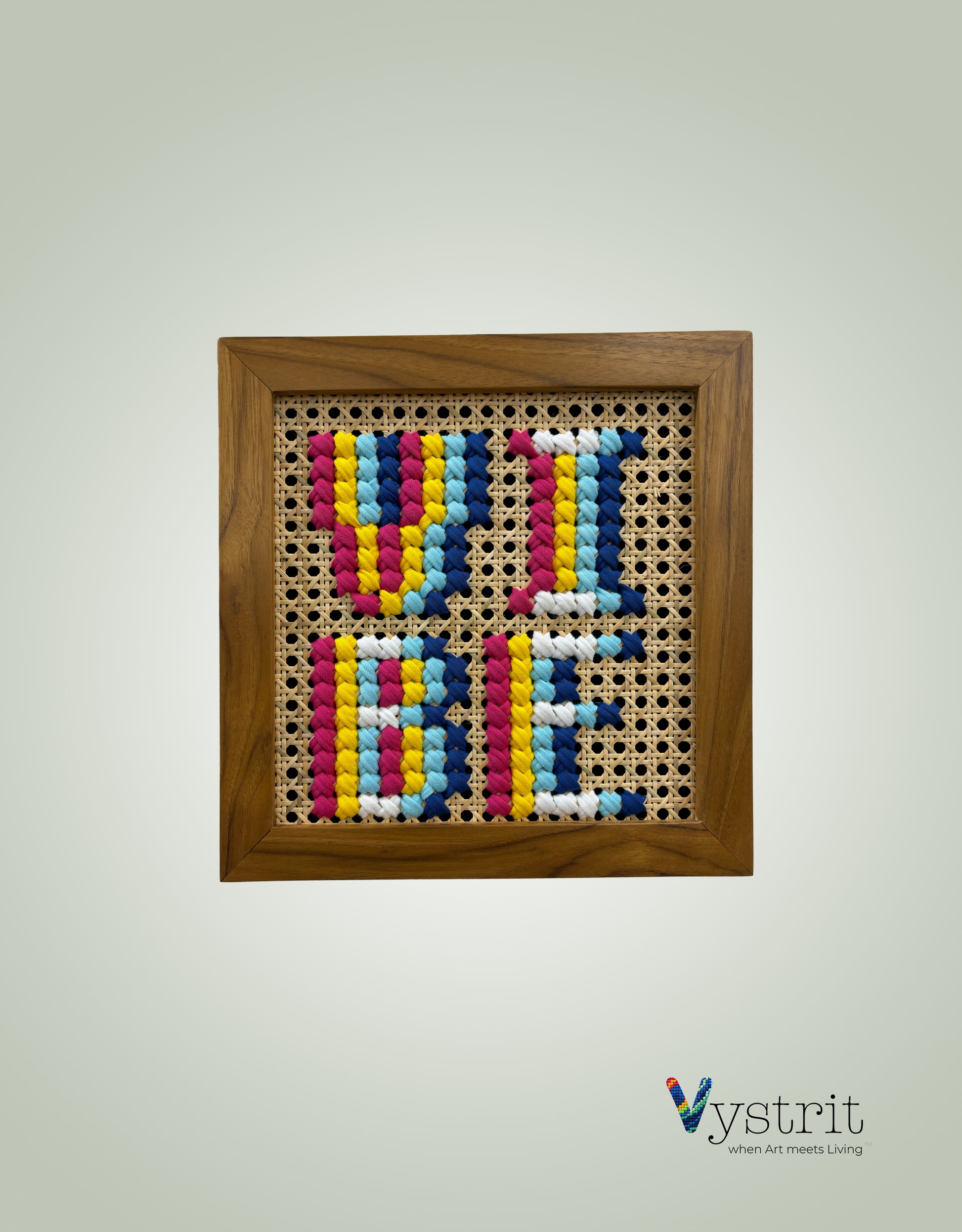 A stunning and vibrant representation of the word "VIBE," crafted with intricate hand-stitching on natural rattan mesh. Each letter is formed using colorful threads, with every letter uniquely designed in shades of purple, yellow, light blue, navy blue, and white, creating a lively and harmonious composition. This textile art exudes an energetic and uplifting aura, bringing the essence of positivity and good vibes to life through the skillful combination of craftsmanship and color.