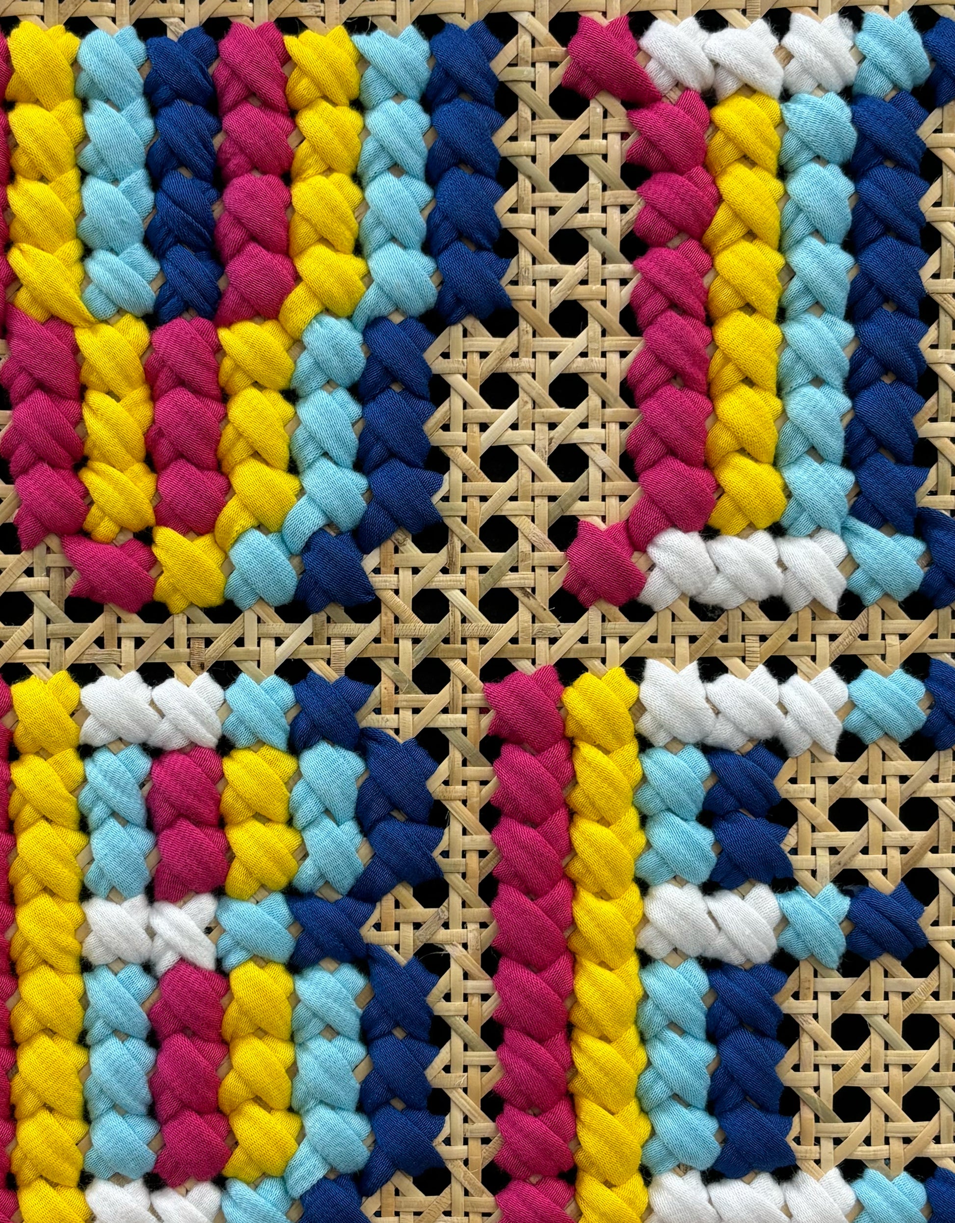 Art: Mixed textile art hand-stitched on cane webbing, with each letter of "VIBE" intricately embroidered in vibrant shades of purple, yellow, light blue, navy blue, and white.
