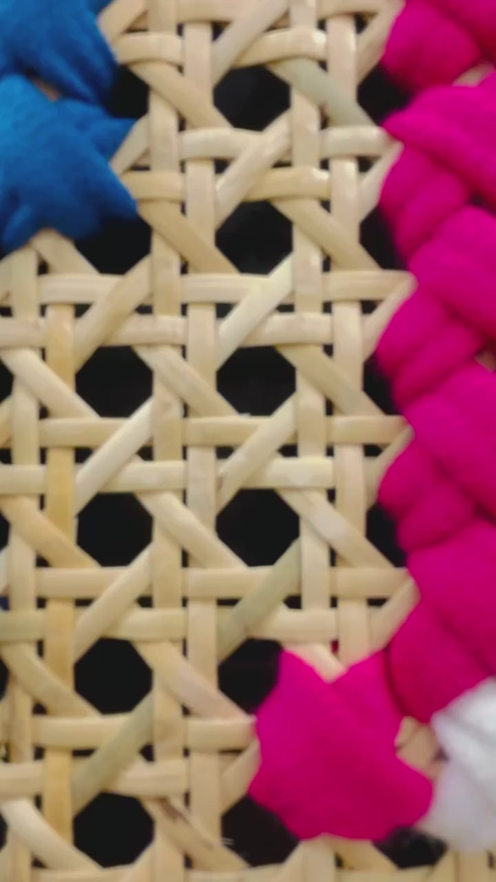 Material: Handmade Teak wood frame, natural star pattern rattan mesh (cane webbing), textile/threads