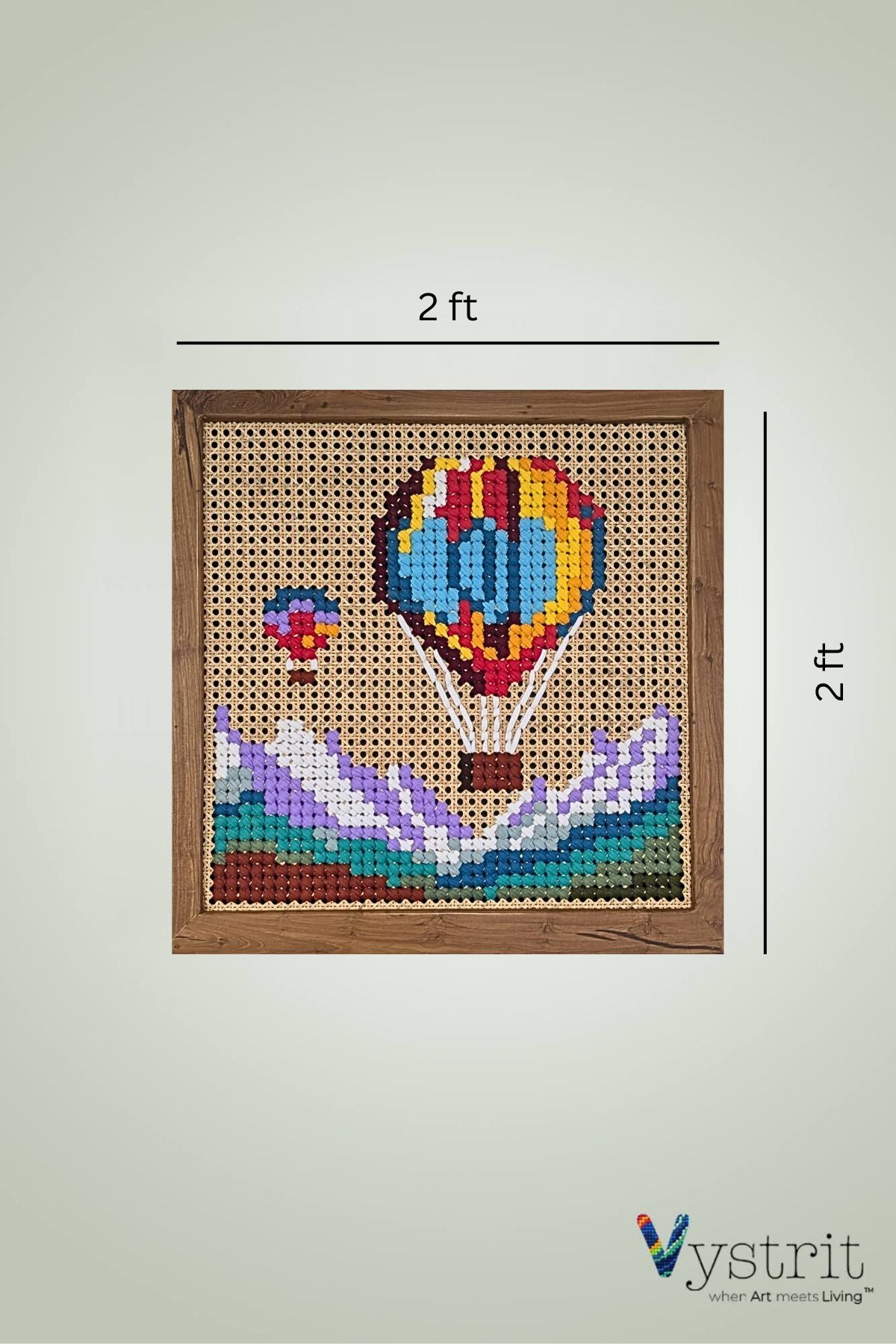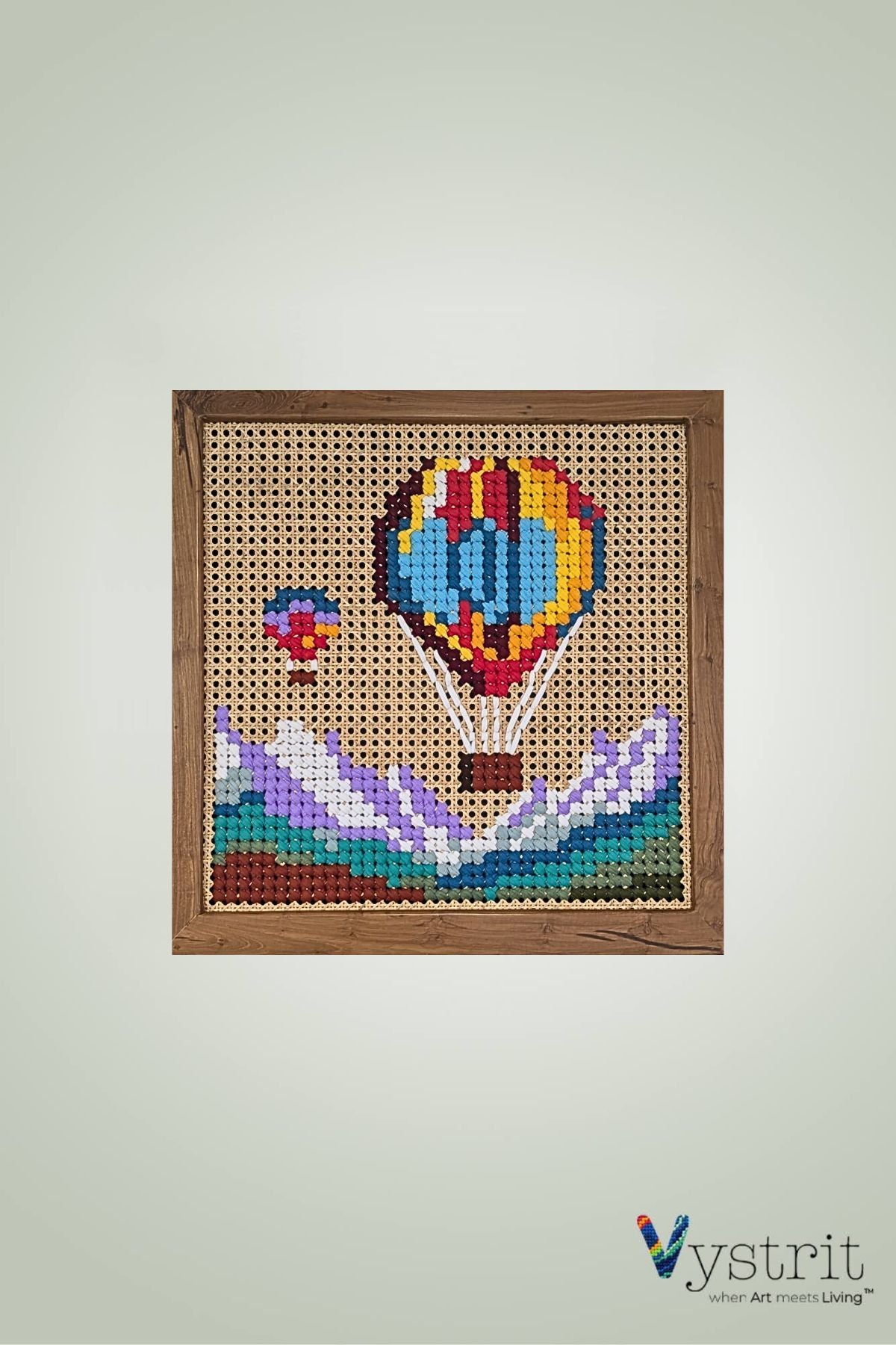 Meticulously hand-stitched using colored threads on natural cane webbing, each detail from the balloon’s gentle ascent to the gradient hues of the mountains invites contemplation and a sense of boundless exploration. It's a celebration of freedom, wonder, and the beauty of stillness in motion.