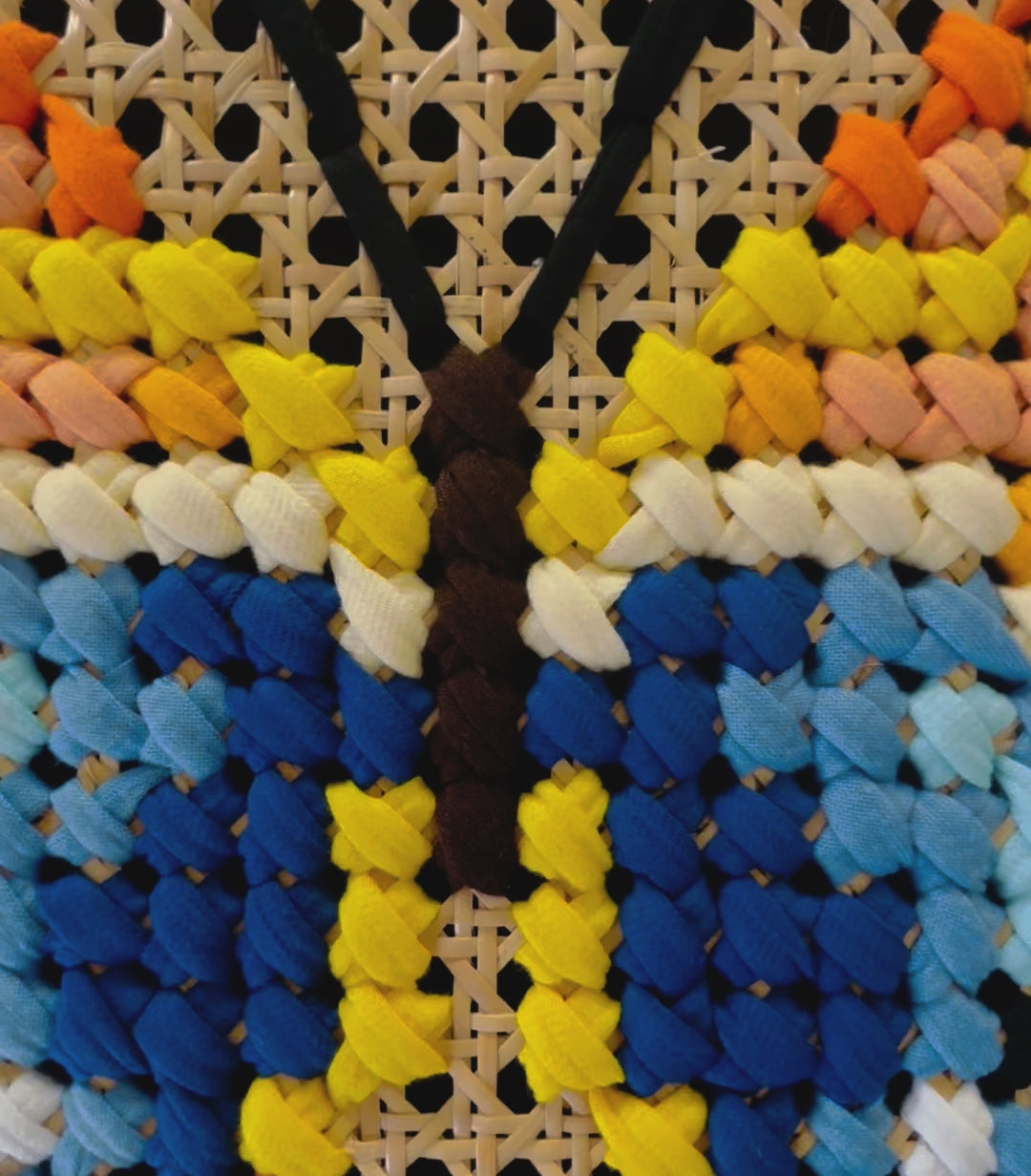 "A captivating butterfly design, delicately hand-stitched to create an elegant display of vibrant colors and intricate patterns. The lower half of the butterfly’s wings features deep shades of dark blue, light blue, and navy blue, while the upper wings are filled with warm hues of yellow, orange, cream, and soft blue, blending harmoniously together. This stunning piece brings the spirit of transformation and beauty to life, evoking a sense of freedom and grace. Each stitch brings out the butterfly’s delicate charm, making it a perfect addition to any space."