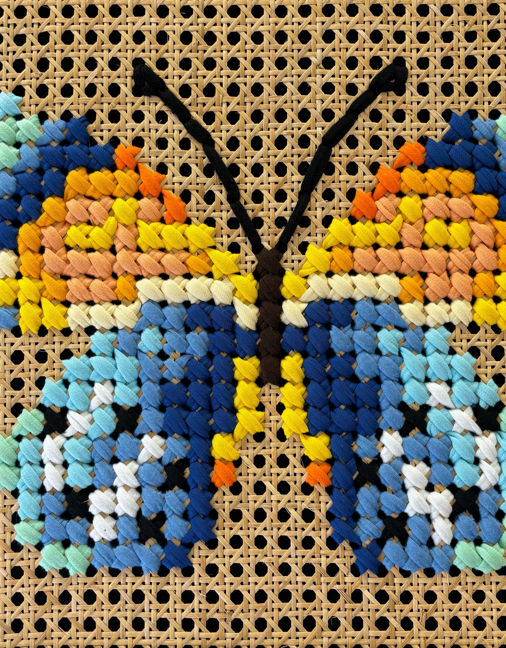 Art: Mixed textile art hand-stitched on cane webbing