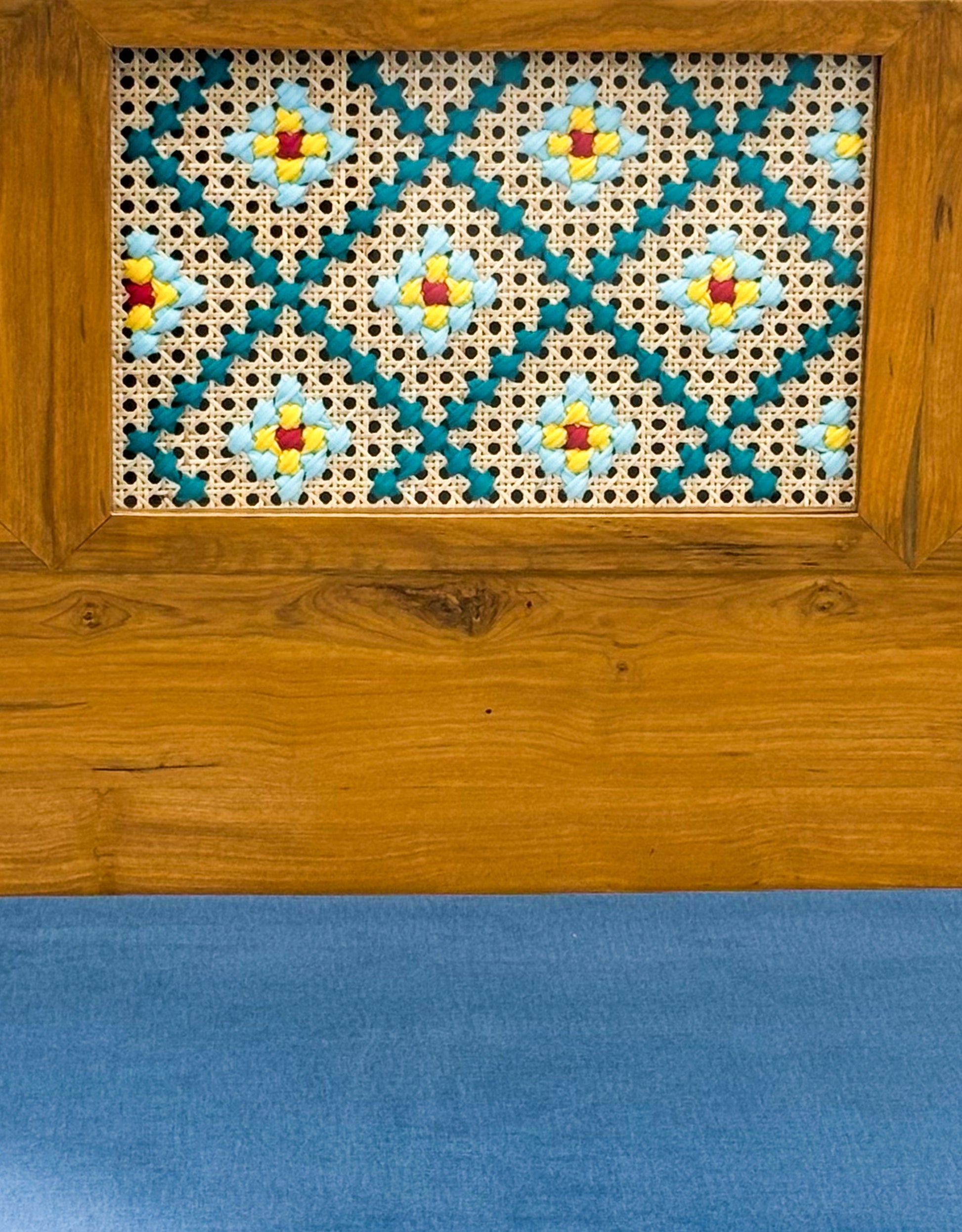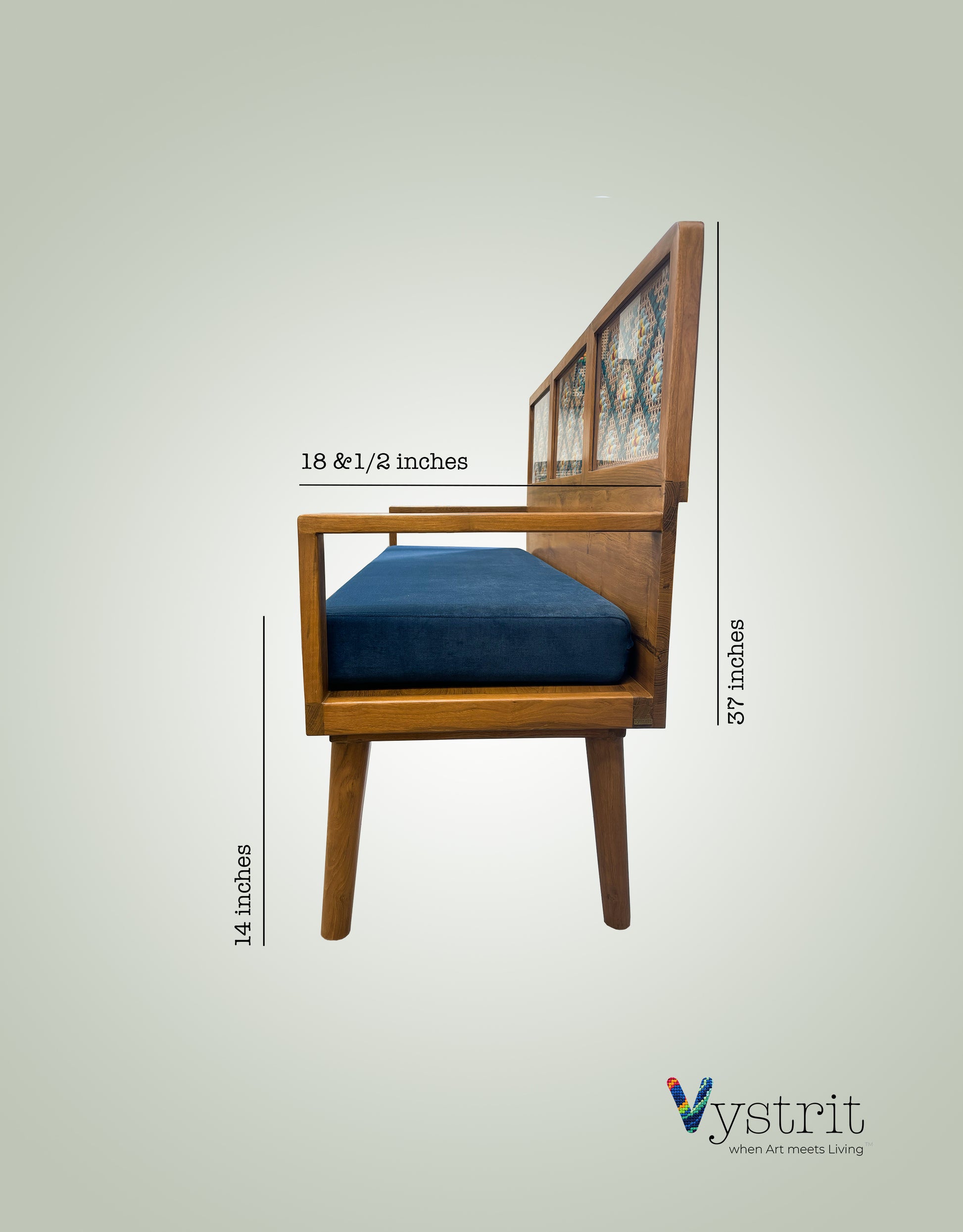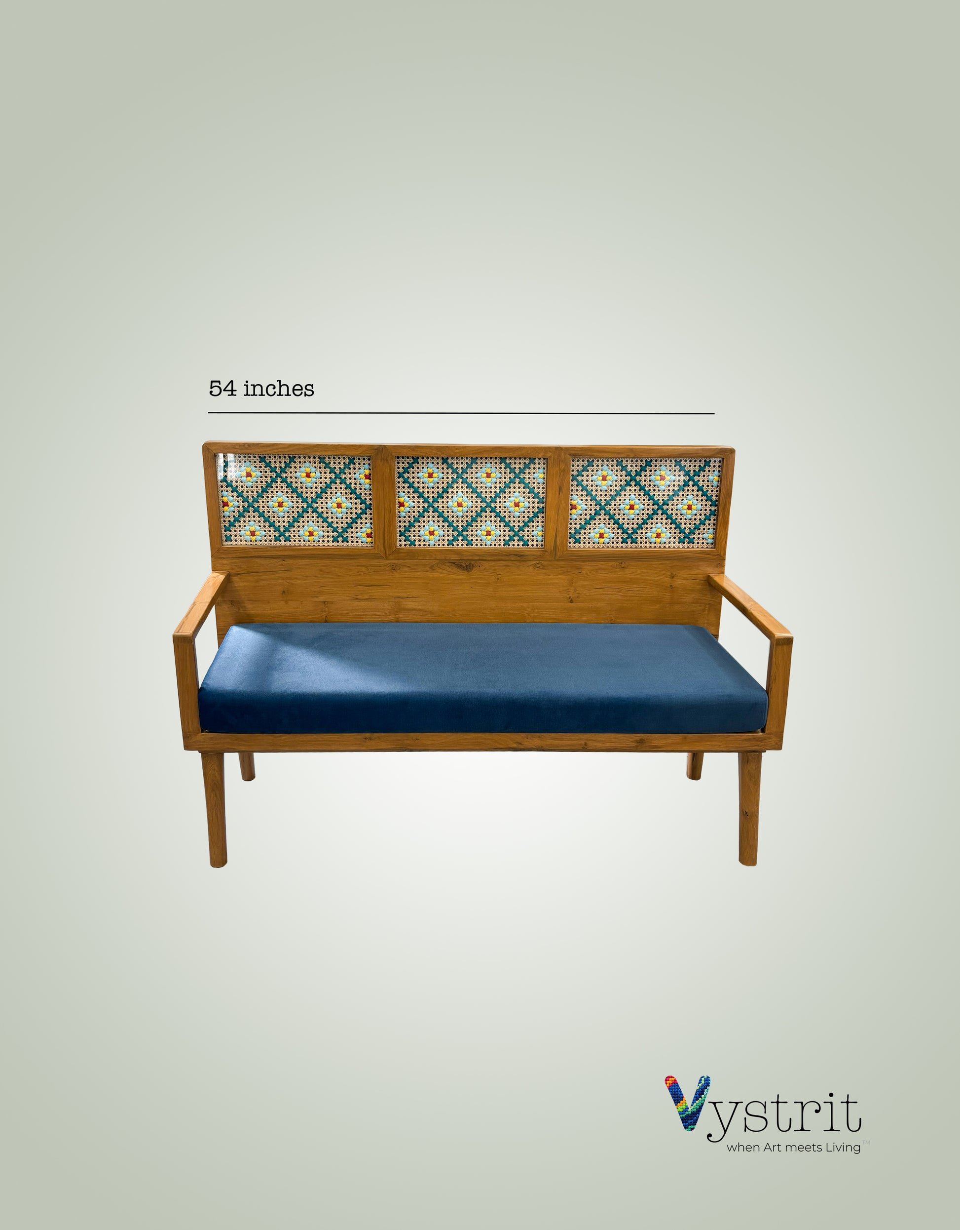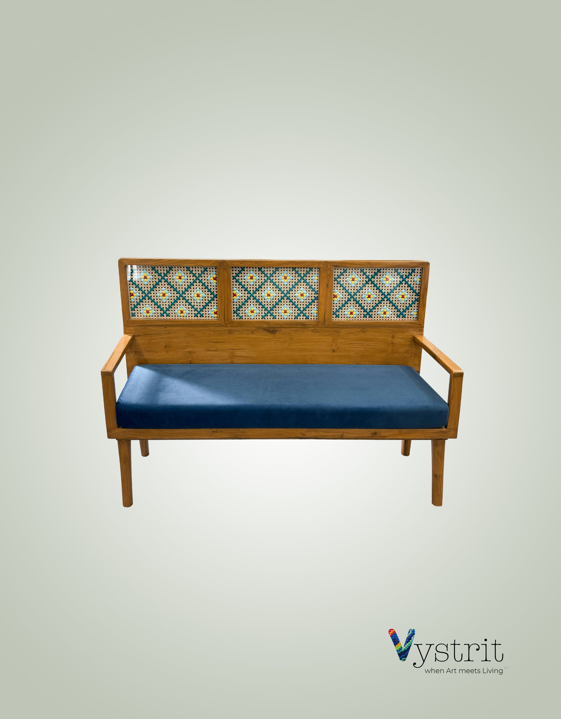 Each sofa is the result of skilled artisanal craftsmanship, with the mandala art carefully handwoven using vibrant cotton threads. Created by talented women artists from grassroots communities, this piece carries a unique cultural essence and individuality. The natural wood grain and woven textures add warmth and character, making each sofa truly one of a kind.